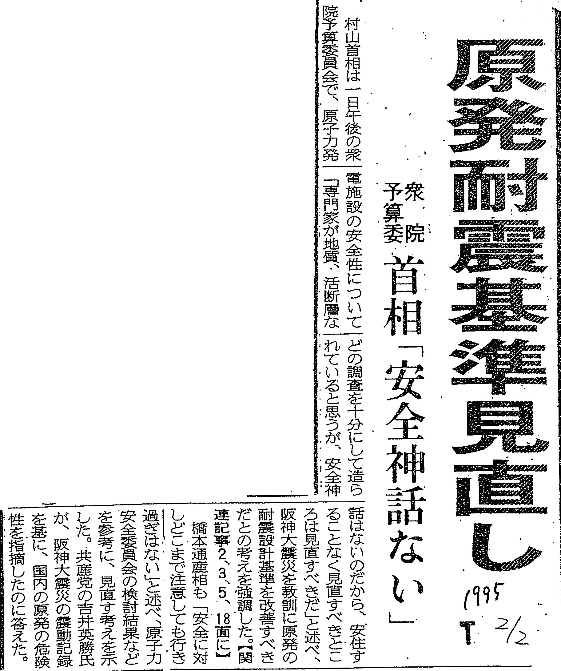 [1995_02_02_01]原発耐震基準見直し 衆院予算委 首相「安全神話ない」(東奥日報1995年2月2日)