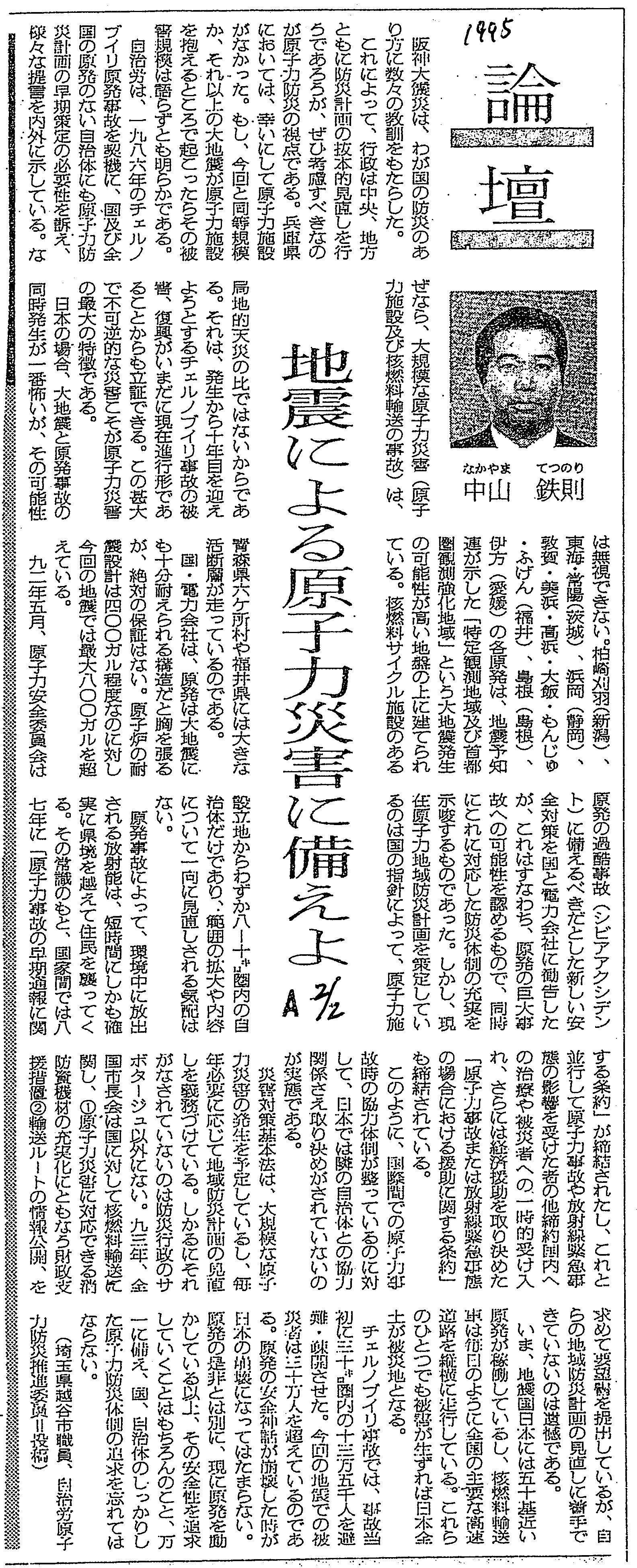 | [1995_02_02_02]論壇 中山鉄則 地震による原子力災害に備えよ(朝日新聞1995年2月2日) |