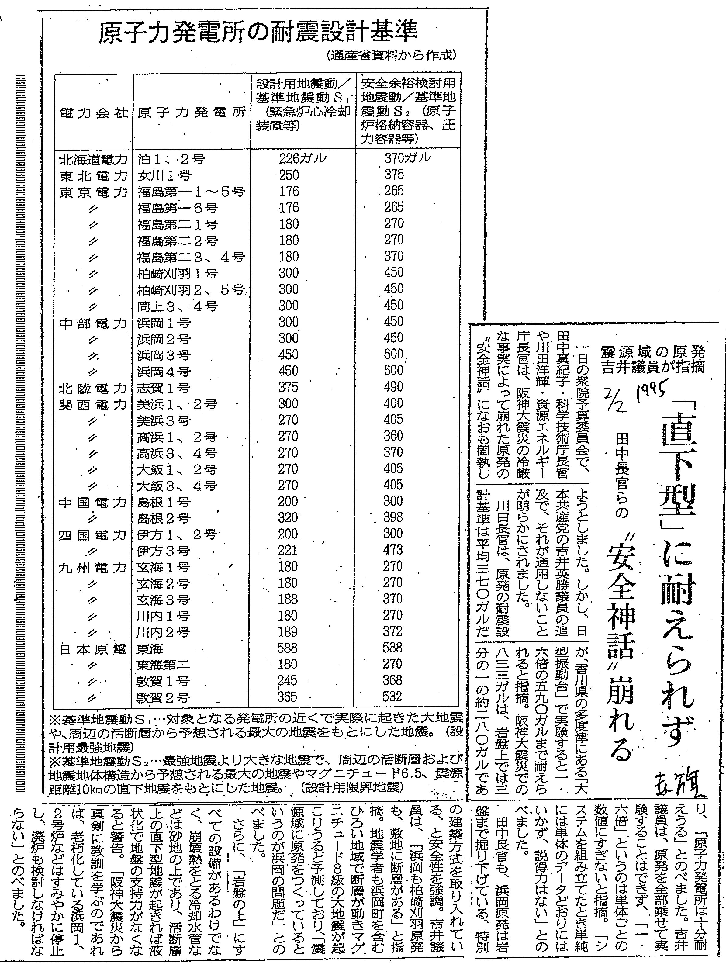 [1995_02_02_03]震源域の原発 吉井議員が指摘 「直下型」に耐えられず 田中長官らの ”安全神話”崩れる 原子力発電所の耐震設計基準(赤旗1995年2月2日)