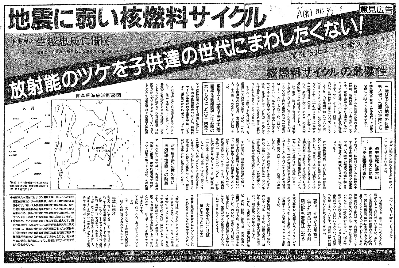 も大きい地震の可能性も ▼昨年暮の三陸はるか沖地震その後の 余震についてどうお考えですか? 核燃料サイクル各施設の敷地の東方の海域は、「地震の巣」として有名なところです。青森県東方沖から北海道日高沖へかけての海底には大小の活断層が存在します。マグニチュード(M)=8・0内外の巨大地震が、ほぼ100年プラス・マイナス10年周期で起こっている他、M=7クラスの大地震も、たびたび起こっています。27年ほど前に1968年十勝沖地震(M=7・9)が起こったので、来世紀中頃にこのクラスの巨大地震が起こると予想されていました。 昨年暮の三陸はるか沖地震は、地震波として出されたエネルギーの大きさでは、1968年十勝沖地震の4分の1程度のM=7・5というものでした。(Mが0・2小さいと、エネルギーは半分になります。)ですから震央位置の如何によっては将来、敷地またはその付近が、三陸はるか沖地震の何倍もの大きさの地震に襲われるおそれもあることになります。 ちなみに、三陸はるか沖地震では、青森県に二人の死者が出ましたが、1968年十勝沖地震の死者は、青森県47人、その他5人の合計52人に達しました。 敷地のすぐ東方の海底大活 断層を施設建設には支障の ないものとした安全審査 ▼その青森東方沖から北海道日高沖にか けての海底活断層については、核燃料 サイクル各施投の安全率査では、どの ような評価がなされたのでしょうか? この海域に多くの海底活断層があることは、以前から知られています。とくに各施設の敷地のすぐ東方の海底に、少なくとも84kmの長さの大活断層がほぼ南北に走っていることが知られています。ところが安全審査ではその海底大活断層は施設の建設に支障のあるものではないことにされてしまいました。 過去敷地に最大の 影響を与えた地震 は安全審査対象外 ▼それでは、核燃料サイクル各施設の中 でも最も危険な再処理施設の安全審査 では、どの程度の規墳の地震が起こる 可能性を考えて審査がなされたのでし ょうか? 設計用最強地震、および設計用限界地震という2種類の地震を想定して審査されました。前者は、過去の地震および近い将来敷地に影響を与えるおそれのある活動度の高い活断層による地震から選ばれるものです。再処理施設については、1902年の三戸地方の地震(M=7・0)・1931年の青森県南東方の地震(M=7・6)および1978年の青森県東岸の地震(M=5・8)の三つが選ばれました。 しかし、過去に敷地またはその近傍に最大の影響をあたえた地震は1968年十勝沖地震であるのに、安全審査では、これを設計用最強地震とは認めていません。 また後者は、地震学的見地に立脚し、前者を上回る地震およひ直下地震について、敷地に最も大きい影響を与えることが考えられるものが選ばれるものです。再処理施設については、M=8.25(震央距離50km、探さ60km)のプレート境界付近の地震およぴM=6・5(震源距離10km)の直下地震が想定されました。 しかし、施設の直下に探さ0qの大地震が起こった時のことなどは想定されていません。いずれにしても、起こることが予想される地震の影響について、安全審査は非常に甘い見方をしています 。 活断層の可能性の高い 再処理工場直下の断層 ▼1988年に地元紙に「再処理工場施設直下に断層、原燃内部資料で判明」という記事が載りましたが、その断層についてどうお考えでしょうか? 安全審査でも、直下に二つの大きな断層かあることは認めていますが、少なくとも第四紀後期の活動は認められないので、再処理施設の建設に支障のある活断層ではないとされています。しかし、その根拠は極めて薄弱です。内部資料も「今の状況証拠だけでは第三者から活断層といわれたら十分説明できない。」「将来裁判になった時などに、このままの証拠で活断層でないとはいいきれない。」と弱気の見解を述べています。活断層の可能性は大きいと言わざるをえません。 変位、変形が大規模に 生じた場合いかなる耐 震設計も無意味となる ▼核燃核施設の地盤はどのようなものな のでしょうか?もし液状化などで施設 が倒壊したら大事故につながると心配 ですが。 表層地盤の盛土などは地震時に液状化のおそれがありますが、基礎地盤は、鷹架層と呼ばれる新第三紀中新世の地層なので、液状化の心配はありません。 しかし、地震に際して、基礎地盤に隆起、沈降、陥没、地割れや、地質断層の出現による水平方向、あるいは垂直方向のずれなどの変位、変形が大規模に生じた場合には、いかなる耐震設計も無意味になり.施設が大きな損壊をこうむるおそれが多分にあると言えます。 大事故を起こせば 滅亡のもとになる ▼最後に政府や青森県におっしゃりたい ことがありましたらお聞かせください。 「繁栄は滅亡のもと」と言いますが、原子力施設の建設によって、かりに一時的に繁栄するようなことがあっても、それが大事故を起こせば、滅亡のもとになります。核燃料サイクルの建設は、日本地図から青森県が消える原因にもなりかねないので、一刻