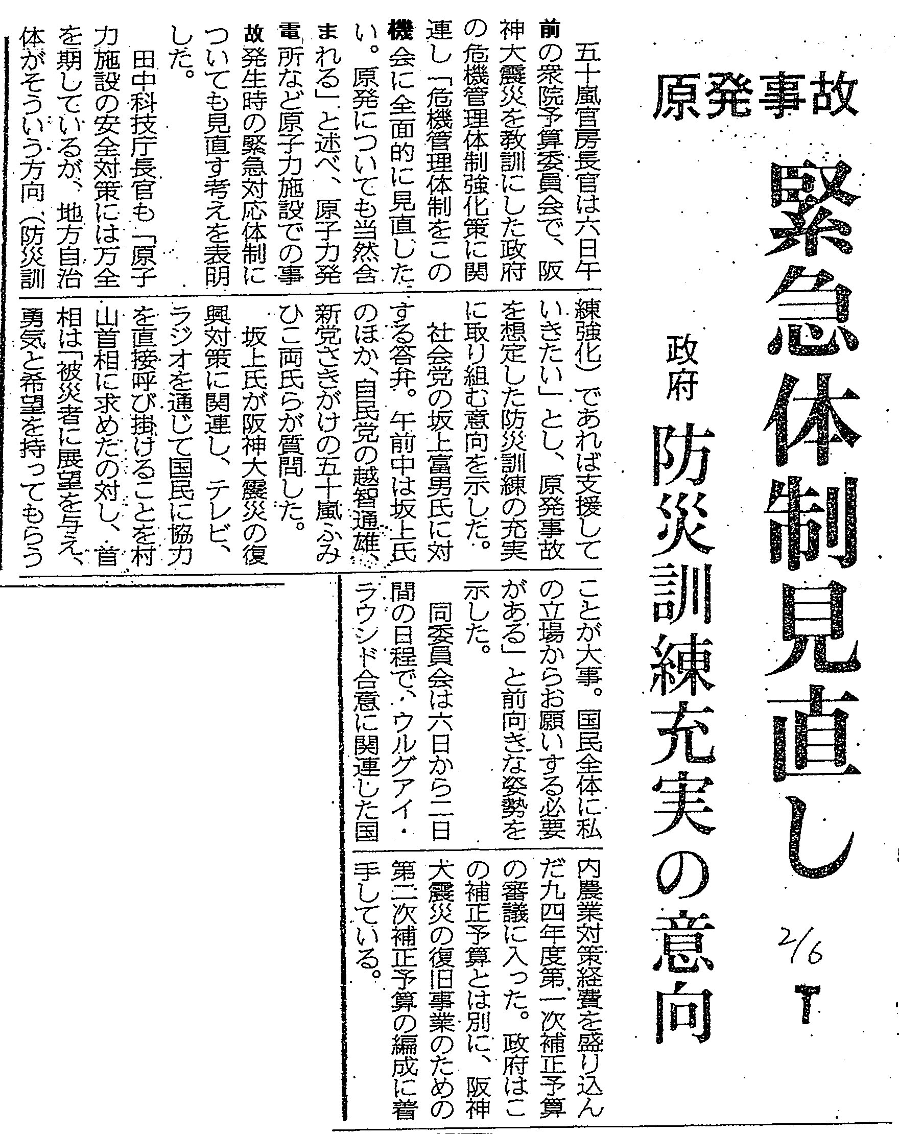 [1995_02_06_01]原発事故 緊急体制見直し 政府 防災訓練充実の意向(東奥日報1995年2月6日)