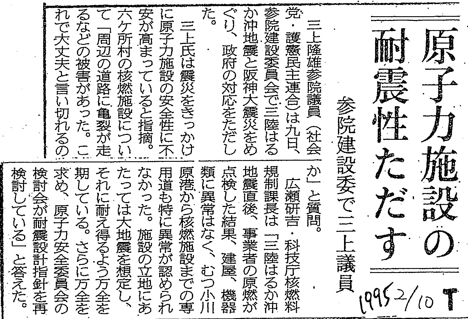 | [1995_02_10_01]原子力施設の耐震性ただす 参院建設委で三上議員(東奥日報1995年2月10日) |