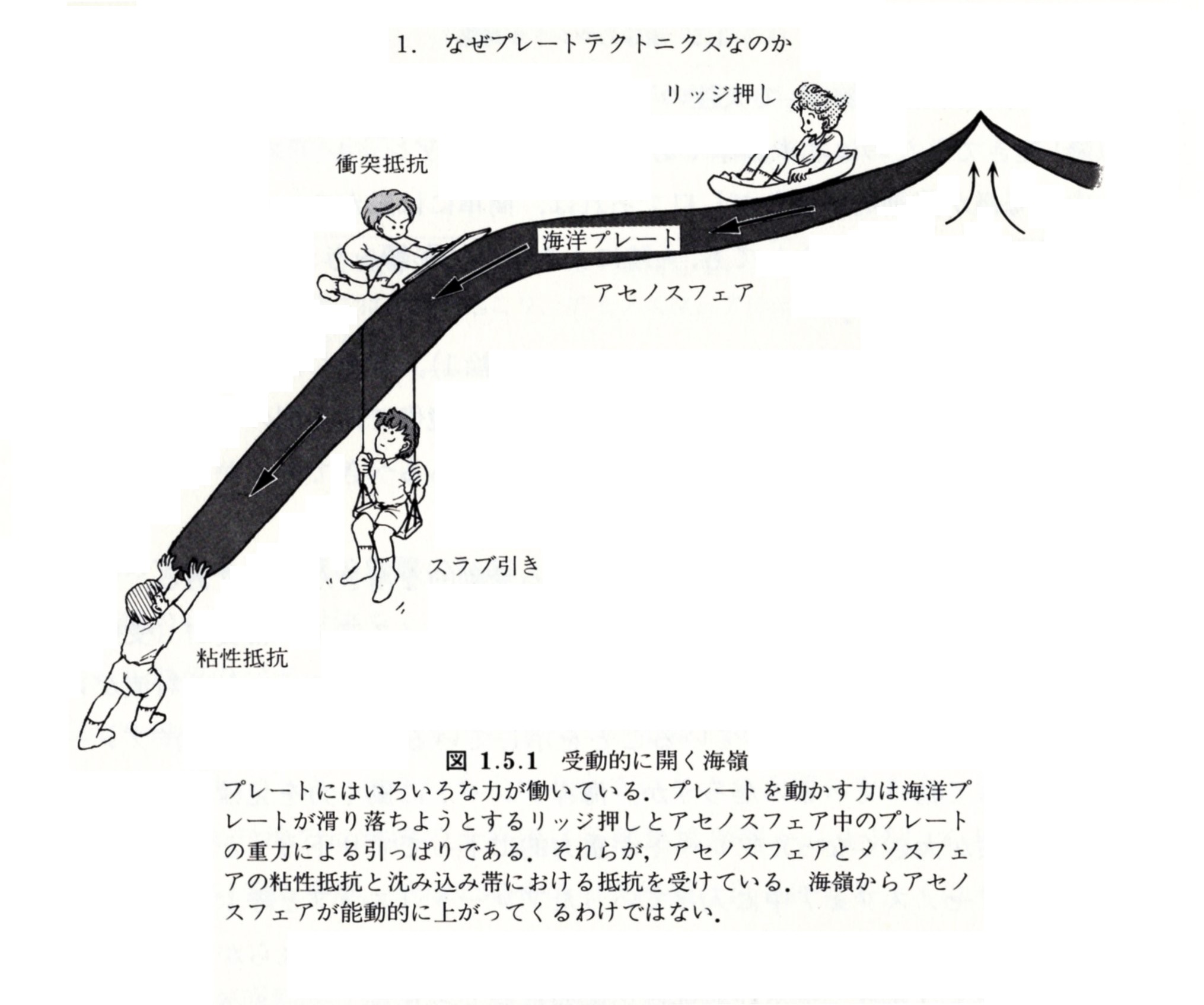 参照元 ※引用者注:p33〜34の一部抜粋 ![]() (前略) これらの事実から大洋中央海嶺は、むしろ受動的な動き出しである、すなわちプレートが両側へ離れていく隙間を下からアセノスフェア物質が(受動的に)上がってきて埋めている、と考えられる。これは地球のマントル対流がレーリーベナール対流と違っていることを示している。それならば海洋プレートはどうして動いているのだろうか。海洋プレートに働く力を見積もってみると冷えて密度が大きくなったプレートが重力的に下がってずり下がろうとするリッジ押しと、アセノスフェア中に入っていったプレート(スラブと呼ぶ)が重力的に引っ張るスラブ引きが大きいことがわかる(続巻参照)、それらがプレートを駆動し、アセノスフェアの粘性抵抗や衝突抵抗と釣り合っているのである(図1.1.1)。 |