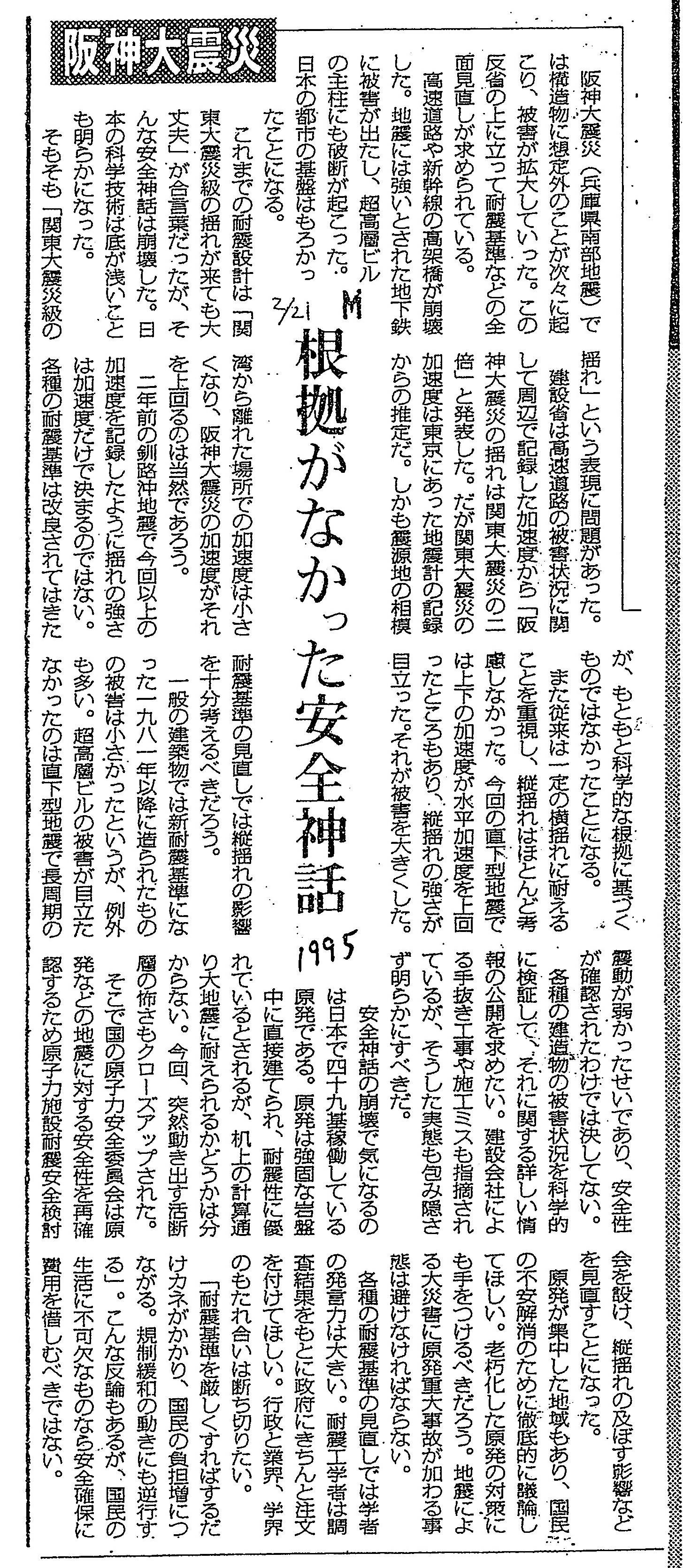 [1995_02_21_01]阪神大震災 根拠がなかった安全神話(毎日新聞1995年2月21日)