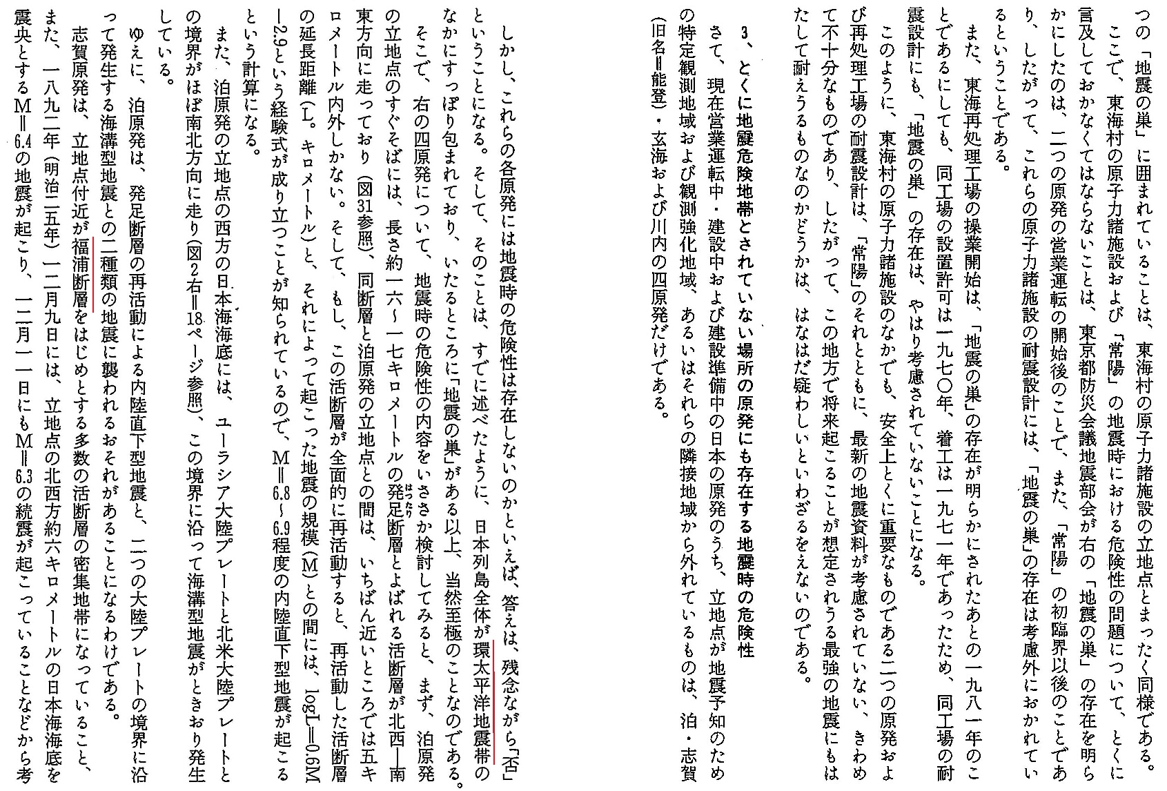 ※編集者注:以下はP194-195をテキスト化したものです。 つの「地震の巣」に囲まれていることは、東海村の原子力諸施設の立地点とまったく同様である。 ここで、東海村の原子力諸施設およぴ「常陽」の地震時における危険性の問題について、とくに言及しておかなくてはならないことは、東京都防災会議地震部会が右の「地震の巣」の存在を明らかにしたのは、二つの原発の営業運転の開始後のことで、また、「常陽」の初臨界以後のことであり、したがって、これらの原子力諸施設の耐震設計には、「地震の巣」の存在は考慮外におかれているということである。 また、東海再処理工場の操業開始は、「地震の巣」の存在が明らかにされたあとの1981年のことであるにしても、同工場の設置許可は1970年、着工は1971年であったため、同工場の耐震設計にも、「地震の巣」の存在は、やはり考慮されていないことになる。 このように、東海村の原子力諸施設のなかでも、安全上とくに重要なものである二つの原発および再処理工場の耐震設計は、「常陽」のそれとともに、最新の地震資料が考慮されていない、きわめて不十分なものであり、したがって、この地方で将来起こることが想定されうる最強の地震にもはたして耐えうるものなのかどうかは、はなはだ疑わしいといわざるをえないのである。 3、とくに地震危険地帯とされていない場所の原発にも存在する地震時の危険性 さて、現在営業運転中・建設中および建設準備中の日本の原発のうち、立地点が地震予知のための特定観測地域および観測強化地域、あるいはそれらの隣接地域から外れているものは、泊・志賀(旧名=能登)・玄海および川内の四原発だけである。 しかし、これらの各原発には地震時の危険性は存在しないのかといえば、答えは、残念ながら「否」ということになる。そして、そのことは、すでに述べたように、日本列島全体が環太平洋地震帯のなかにすっぽり包まれており、いたるところに「地霊の巣」がある以上、当然至極のことなのである。 そこで、右の四原発について、地震時の危険性の内容をいささか検討してみると、まず、泊原発の立地点のすぐそばには、長さ約16〜17kmの発足(はったり)断層とよばれる活断層が北西−南東方向に走っでおり(図31参照)、同断層と泊原発の立地点との間は、いちばん近いところでは五キロメートル内外しかない。そして、もし、この活断層が全面的に再活動すると、再活動した活断層の延長距離(L。km)と、それによって起こった地震の規模(M)との間にはlogL=0.6M−2.9という経験式が成り立つことが知られているので、M=6.8〜6.9程度の内陸直下型地震が起こるという計算になる。 また、泊原発の立地点の西方の日本海海底には、ユーラシア大陸プレートと北米大陸プレートとの境界がほぼ南北方向に走り(図2右=18ページ参照)、この境界に沿って海溝型地震がときおり発生している。 ゆえに、泊原発は、発足断層の再活動による内陸直下型地震と、二つの大陸プレートの境界に沿って発生する海溝型地震との二種類の地震に襲われるおそれがあることになるわけである。 志賀原発は、立地点付近が福浦断層をはじめとする多数の活断層の密集地帯になっていること、また、1892年(明治25年)12月9日には、立地点の北西方約六kmの日本海海底を震央とするM=6.4の地震が起こり、12月11日にもM=6.3の続震が起こっていることなどから考 |