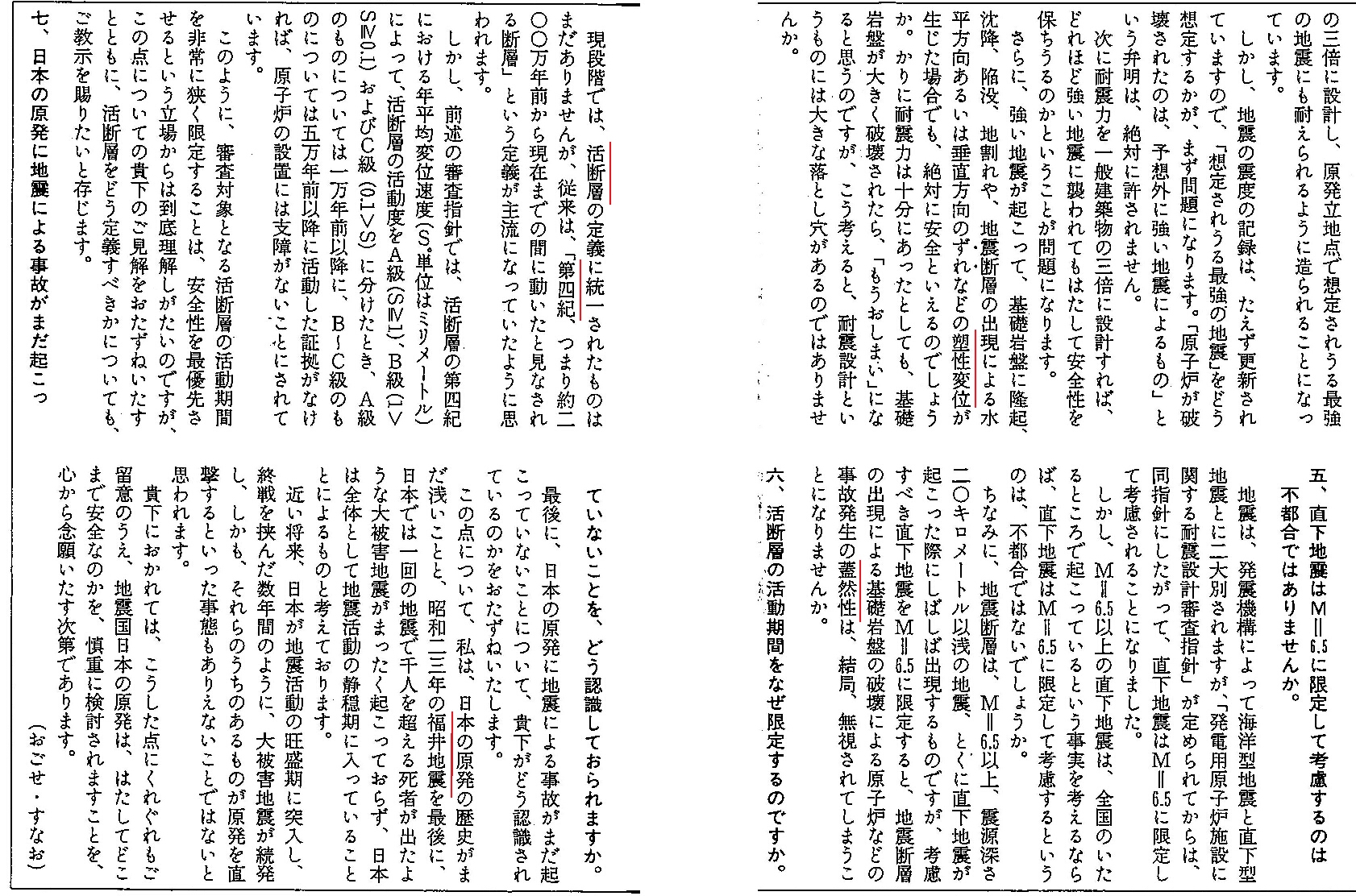 最後に、日本の原発に地震による事故がまだ起こっていないことについて、貴下がどう認識されているのかをおたずねいたします。 この点について、私は、日本の原発の歴史がまだ浅いことと、昭和23年の福井地震を最後に、日本では1回の地震で千人を超える死者が出たような大被害地震がまったく起こっておらず、日本は全体として地震活動の静穏期に入っていることによるものと考えております。 近い将来、日本が地震活動の旺盛期に突入し、終戦を挟んだ数年問のように、大被害地震が続発し、しかも、それらのうちのあるものが原発を直撃するといった事態もありえないことではないと思われます。 貴下におかれては、こうした点にくれぐれもご留意のうえ、地震国日本の原発は、はたしてどこまで安全なのかを、慎重に検討されますことを、心から念願いたす次第であります。 (おごせ・すなお) |