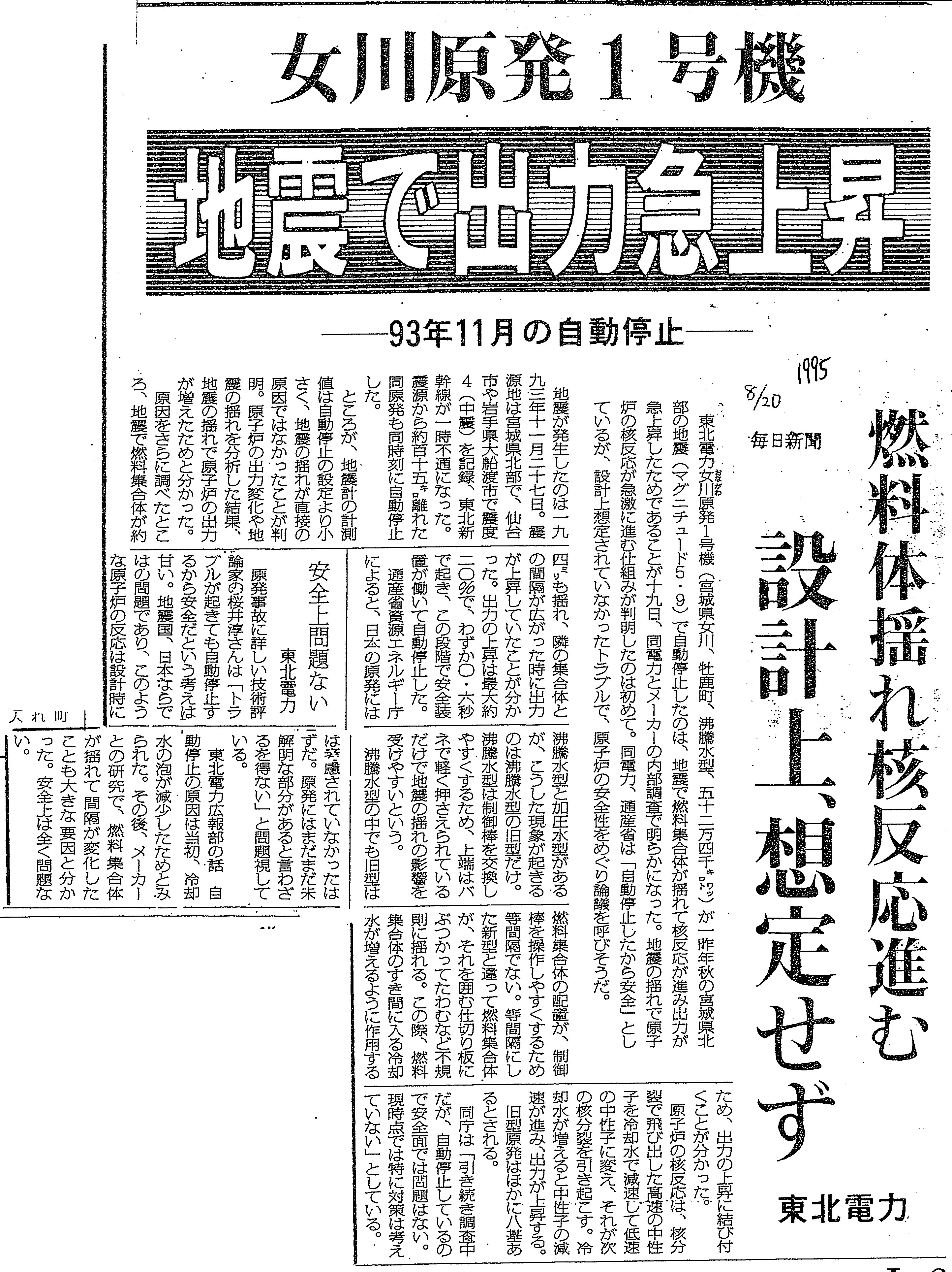 [1995_08_20_01]女川原発1号機 地震で出力急上昇 93年11月の自動停止 燃料体揺れ核反応進む 設計上、想定せず(毎日新聞1995年8月20日)