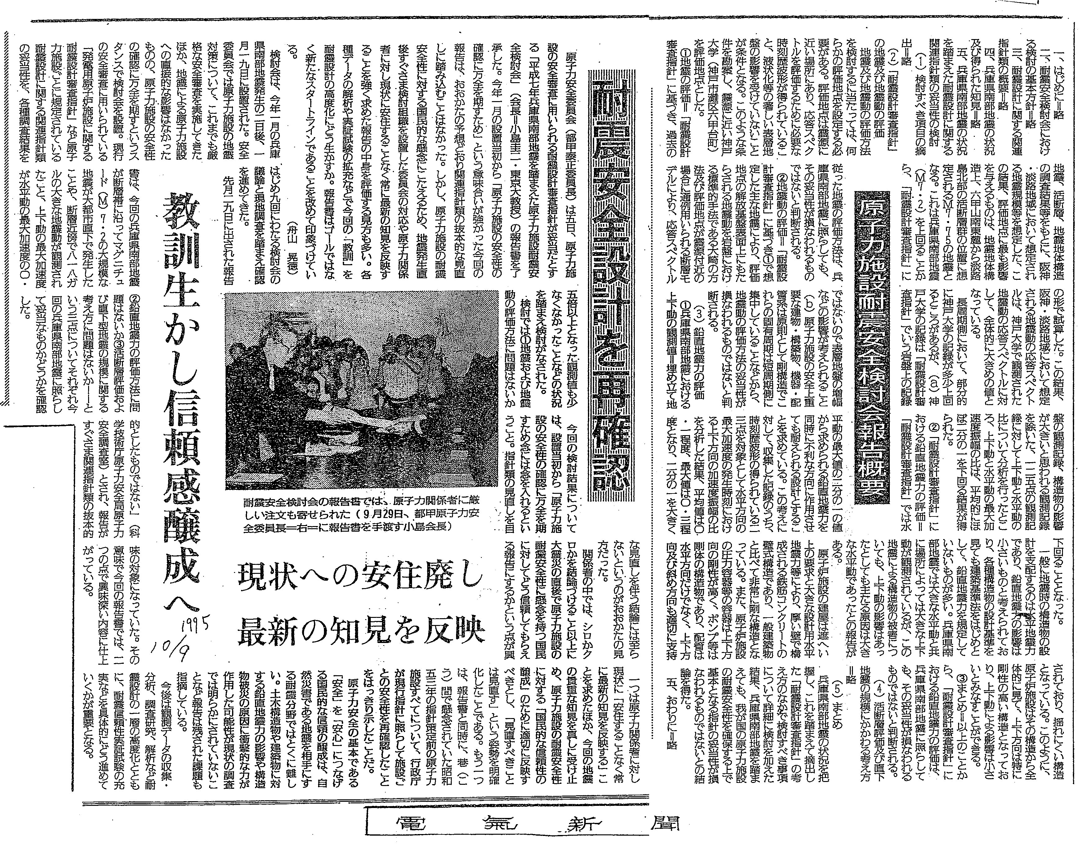 | [1995_10_09_01]原子力施設耐震安全検討会報告概要 耐震安全設計を再確認 現状への安住廃し 最新の知見を反映 教訓生かし信頼感醸成へ(電気新聞1995年10月9日) |