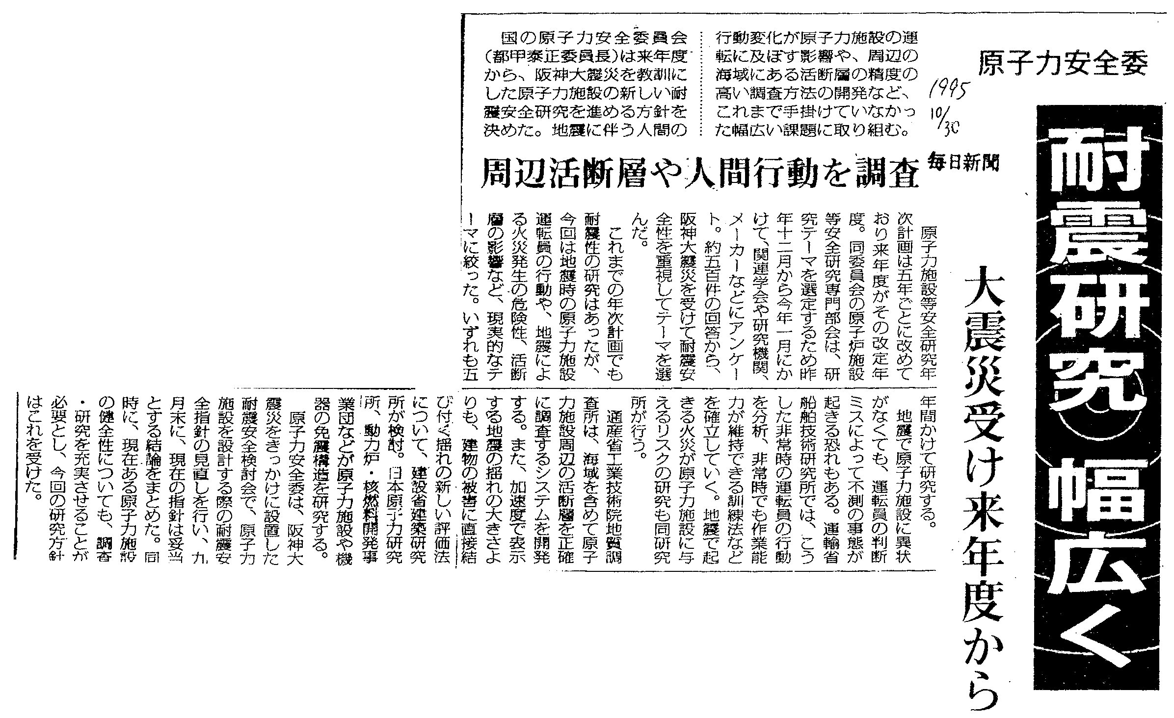 [1995_10_30_01]原子力安全委 耐震研究幅広く 大震災受け来年度から 周辺活断層や人間行動を調査(毎日新聞1995年10月30日)