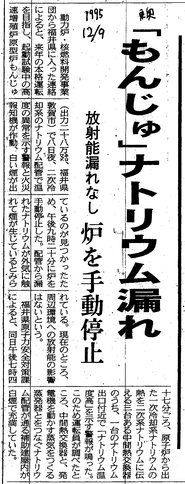 ※以下は上記本文中から重要と思われるヶ所を抜粋し、テキスト化したものである 動力炉・核燃料事業団から福井県に入った連絡によると、来年の本格運転を目指し、起動試験中の高速増殖炉もんじゅ(出力28万キロワット、福井県敦賀市)で8日夜、二次冷却系のナトリウム配管で温度の異常を示す警報と火災報知機が作動、白い煙が出ているのが見つかったため、午後9時20分に炉を手動停止した。配管から漏れたナトリウムが外気に触れて煙が生じているとみられている。 |