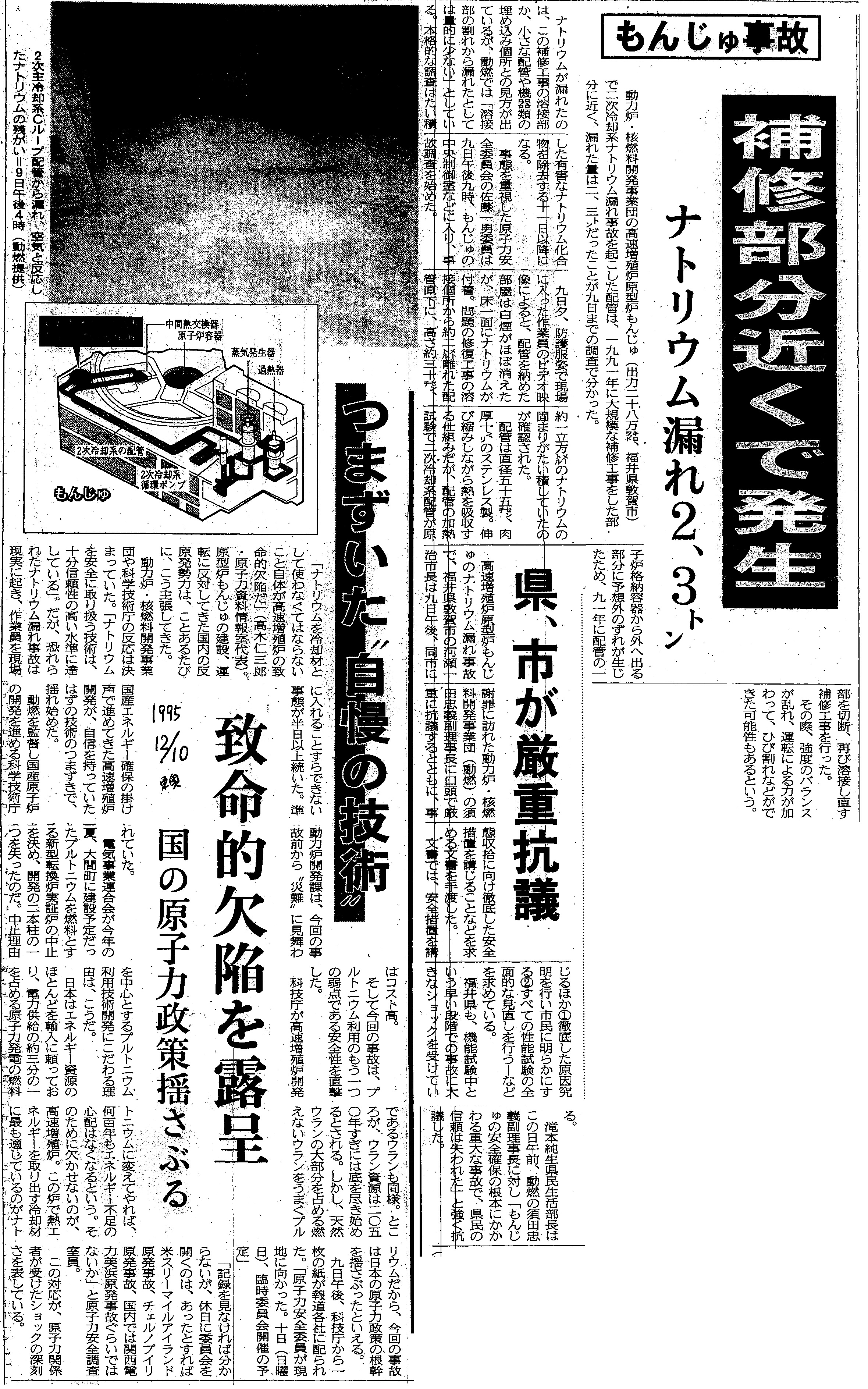| [1995_12_10_01]もんじゅ事故 補修部分近くで発生 ナトリウム漏れ2、3トン 県、市が厳重注意 つまづいた”自慢の技術” 致命的欠陥を露呈 国の原子力政策揺さぶる(東奥日報1995年12月10日) |