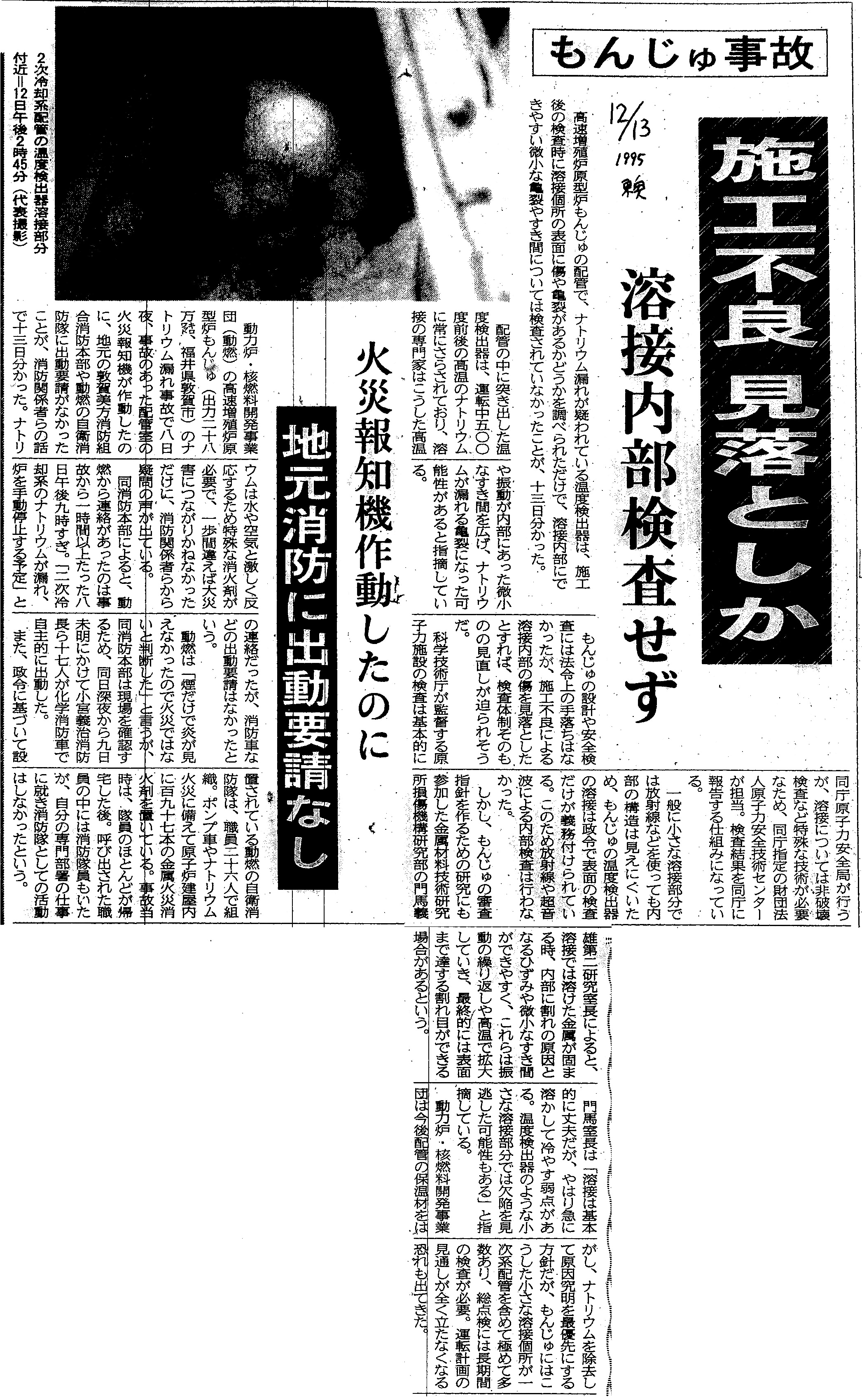 [1995_12_13_01]もんじゅ事故 施工不良 見落としか 溶接内部検査せず 火災報知器作動したのに 地元消防に出動要請なし(東奥日報1995年12月13日)