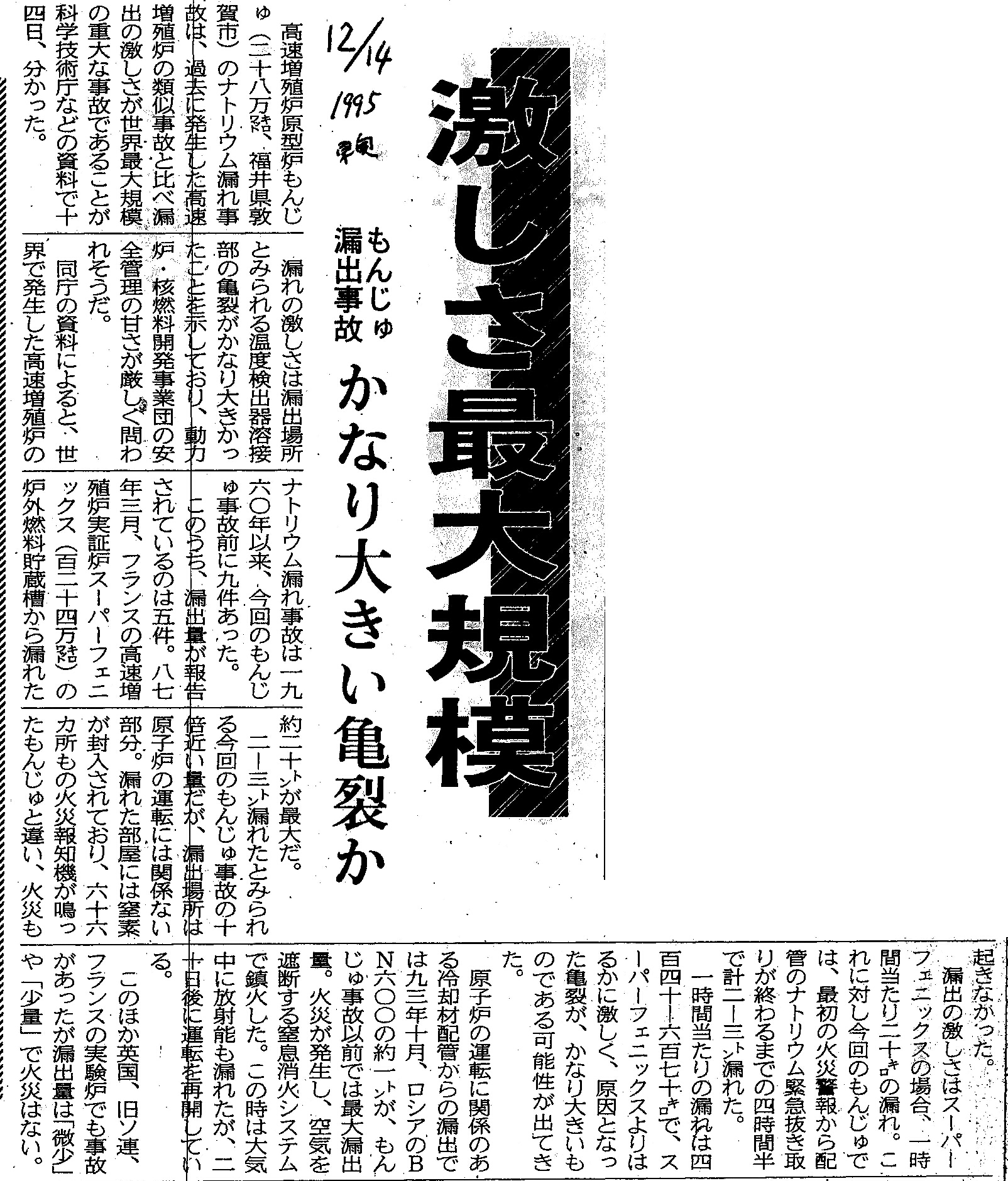 [1995_12_14_01]激しさ最大規模 もんじゅ漏出事故 かなり大きい亀裂か(東奥日報1995年12月14日)