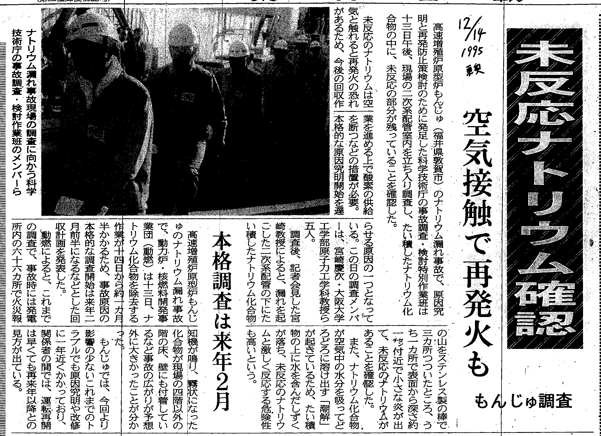 [1995_12_14_02]未反応ナトリウム確認 空気接触で再発火も もんじゅ調査 本格調査は来年2月(東奥日報1995年12月14日)