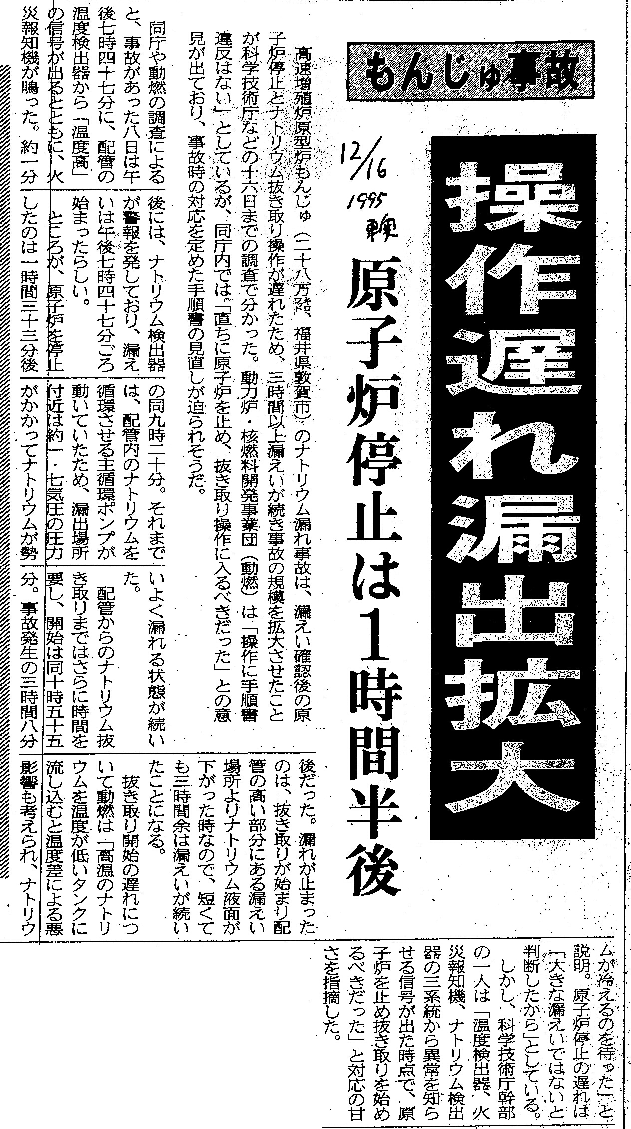 [1995_12_16_01]もんじゅ事故 操作遅れ漏出拡大 原子炉停止は1時間半後(東奥日報1995年12月16日)
