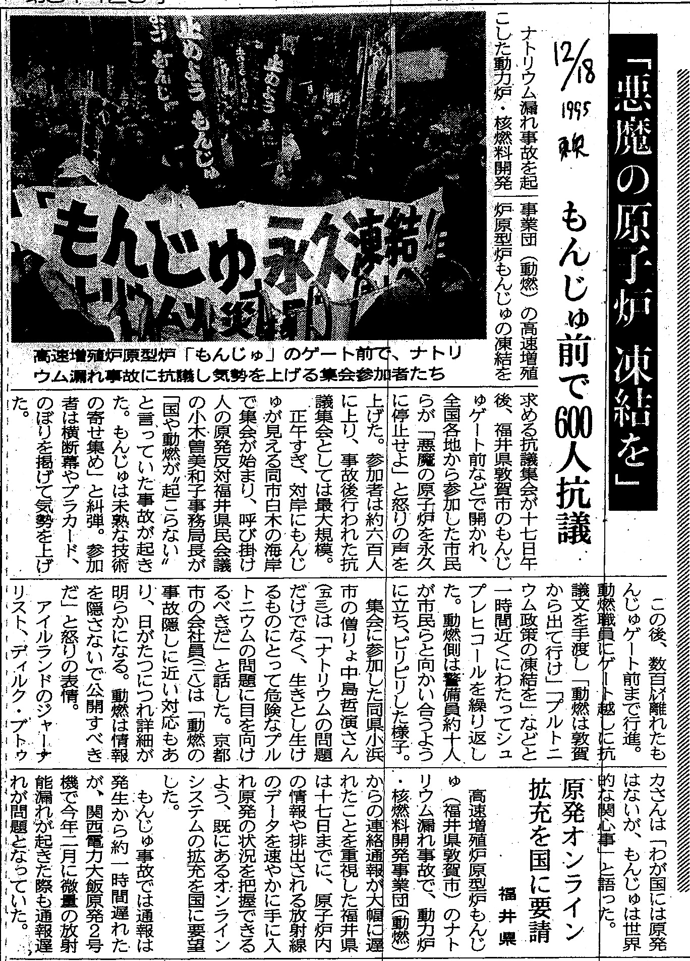 [1995_12_18_01]「悪魔の原子炉 凍結を」 もんじゅ前で600人抗議 原発オンライン拡充を国に要請 福井県(東奥日報1995年12月18日)
