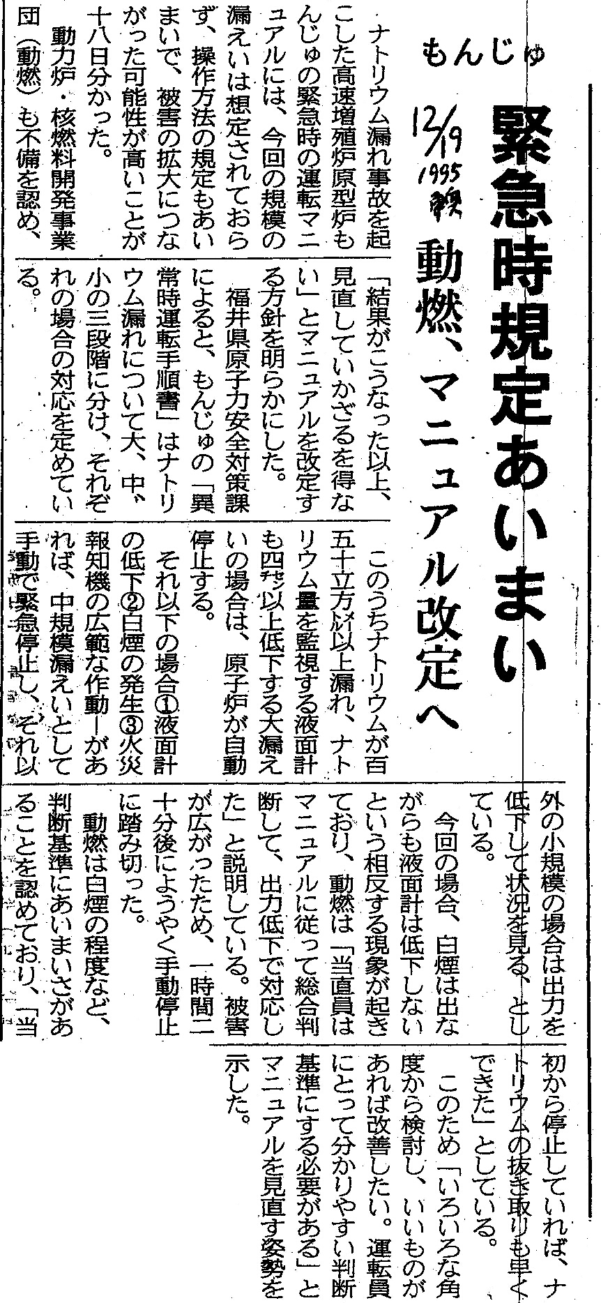 [1995_12_19_01]もんじゅ 緊急時規定あいまい 動燃、マニュアル改定へ(東奥日報1995年12月19日)