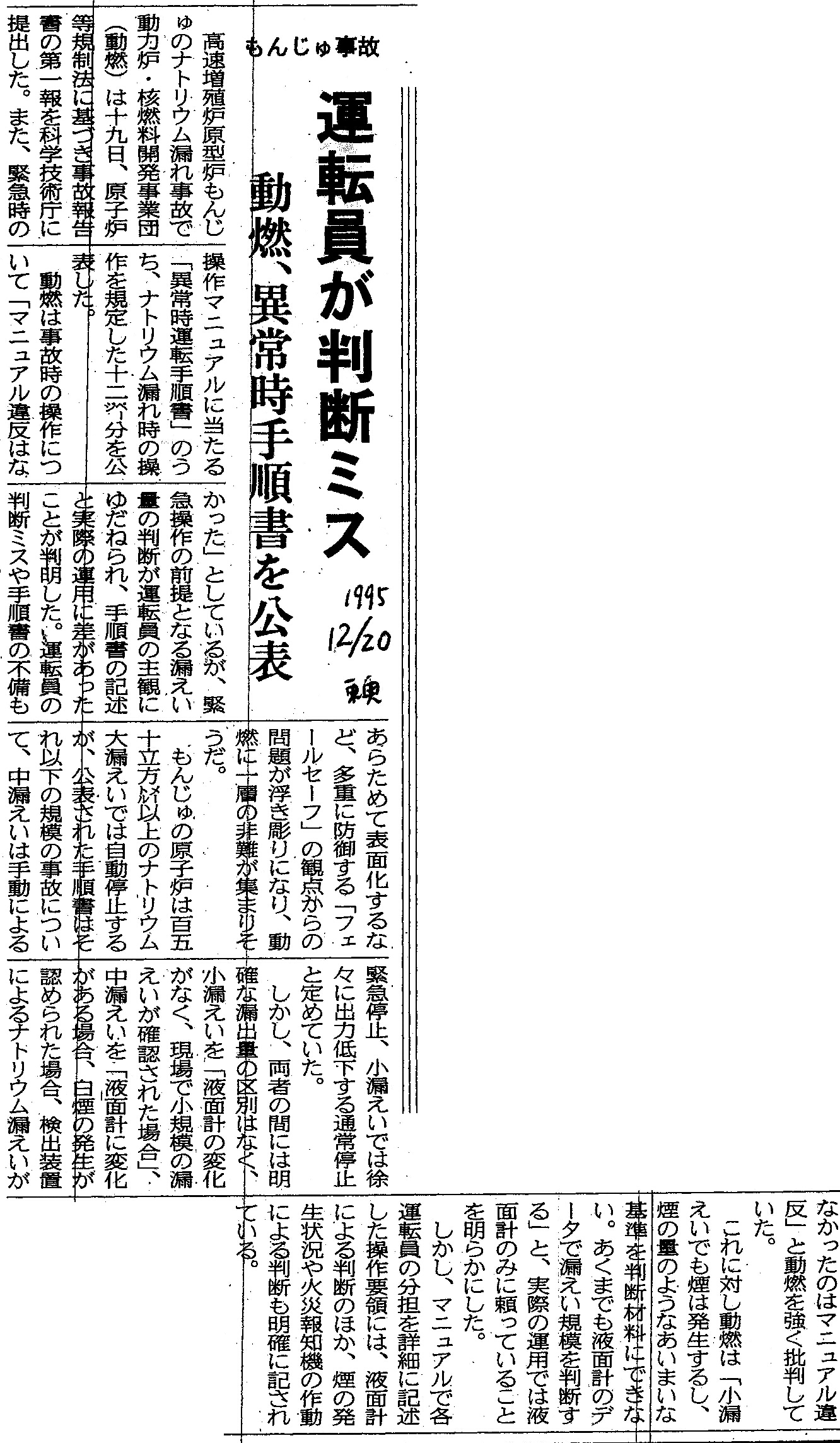 [1995_12_20_03]もんじゅ事故 運転員が判断ミス 動燃、異常時手順書を公表(東奥日報1995年12月20日)