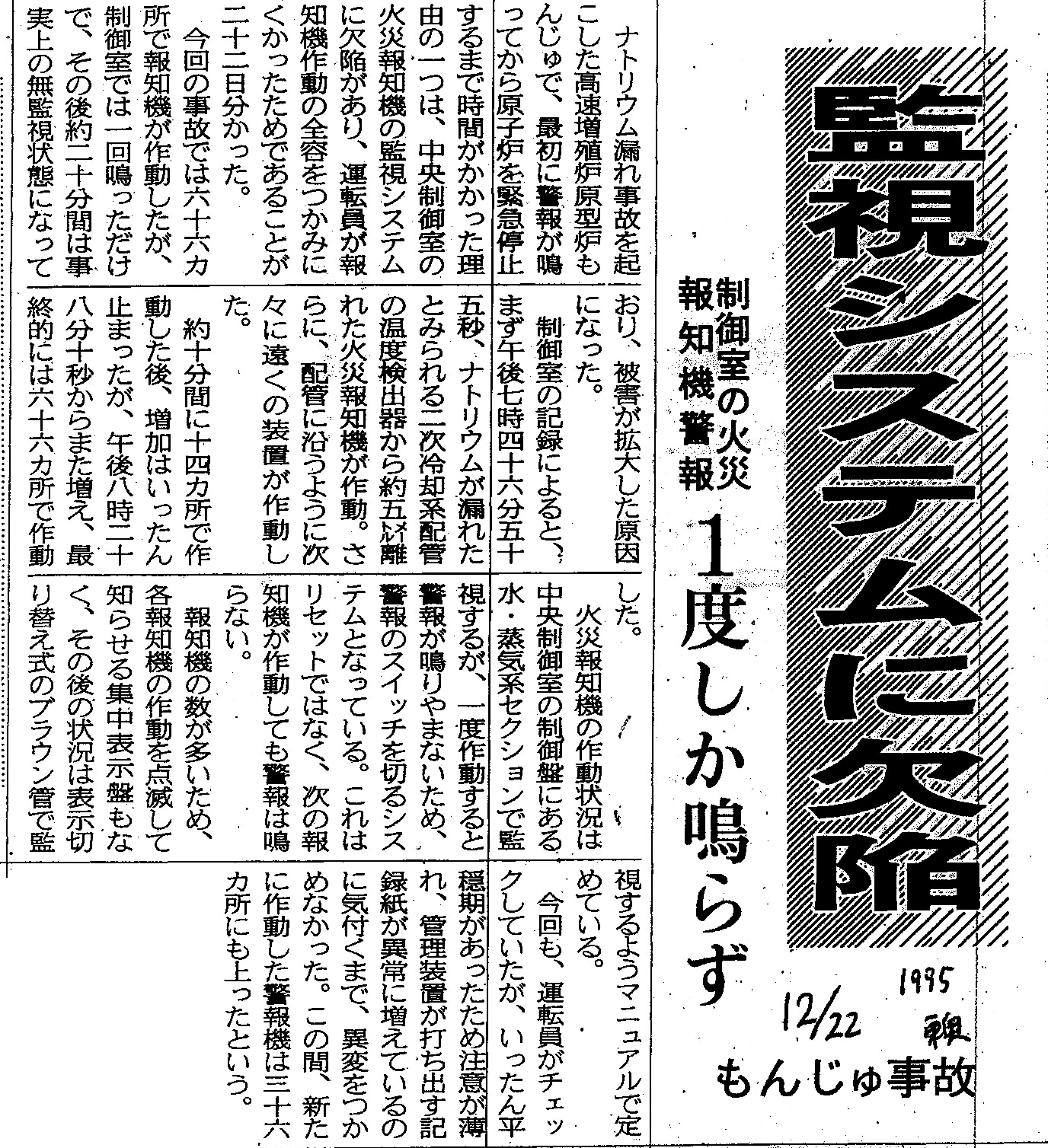 [1995_12_22_01]監視システムに欠陥 制御室の火災報知器警報 1度しか鳴らず もんじゅ事故(東奥日報1995年12月22日)