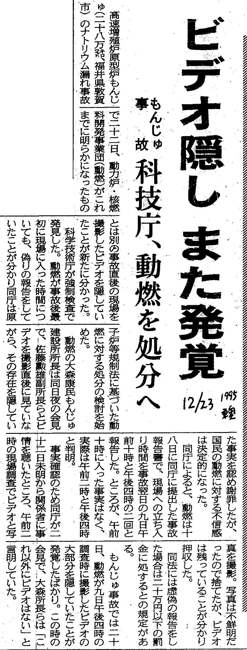 [1995_12_23_01]ビデオ隠し また発覚 もんじゅ事故 科技庁、動燃を処分へ(東奥日報1995年12月23日)