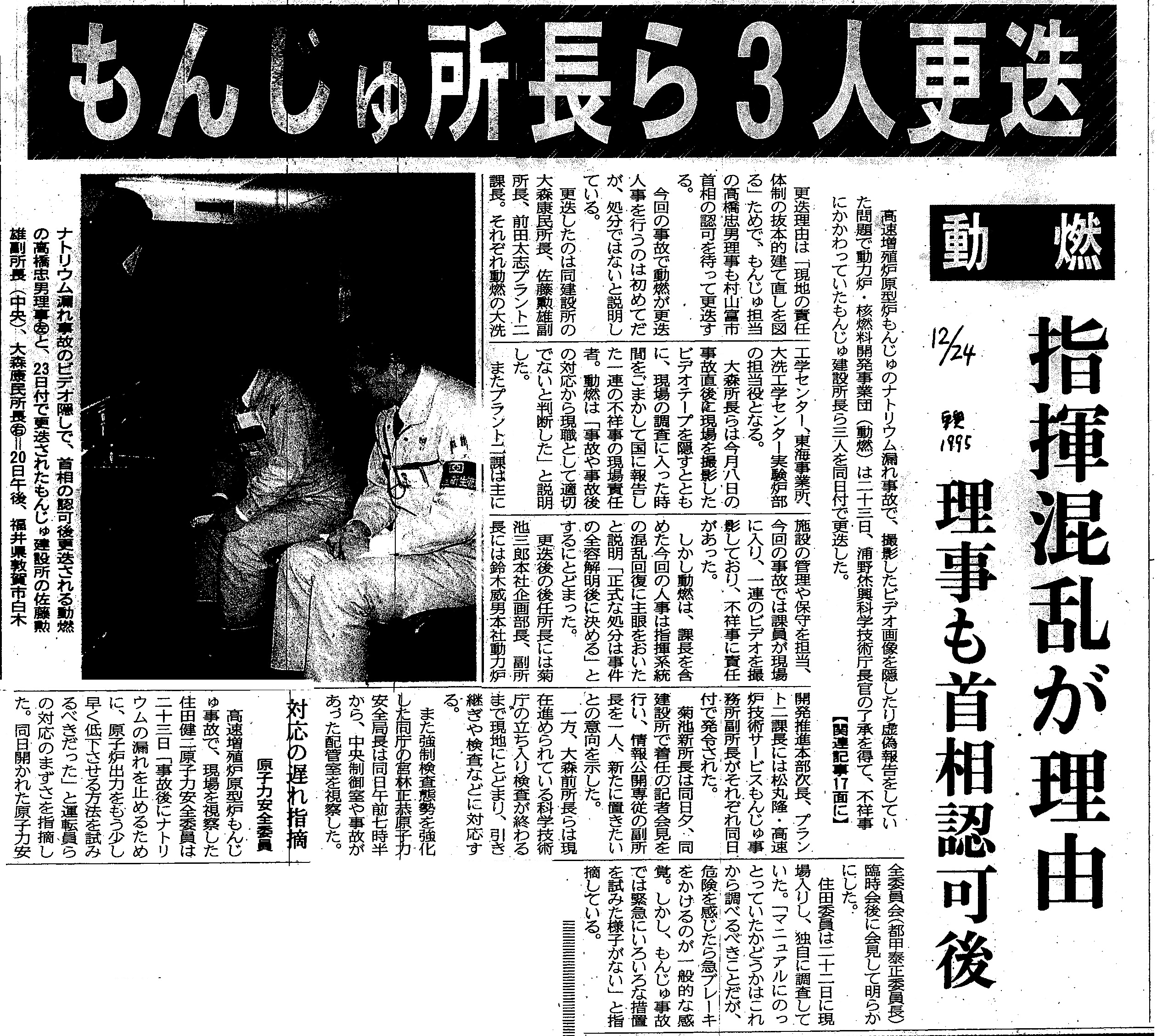 [1995_12_24_02]もんじゅ所長ら3人更迭 動燃 指揮混乱が理由 理事も首相認可後(東奥日報1995年12月24日)