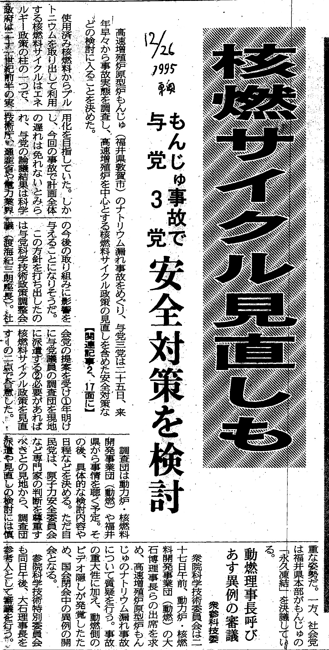 [1995_12_26_02]核燃サイクル見直しも もんじゅ事故で与党3党 安全対策を検討 動燃理事長予備 あす異例の審議 衆参科技委(東奥日報1995年12月26日)