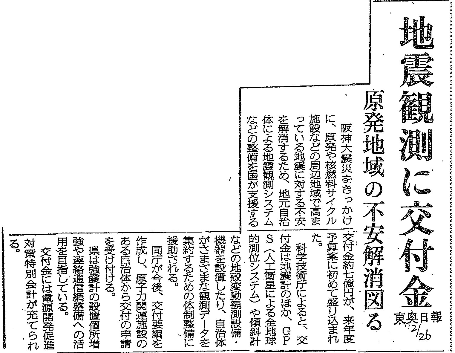 [1995_12_26_03]地震観測に交付金 原発地域の不安解消図る(東奥日報1995年12月26日)