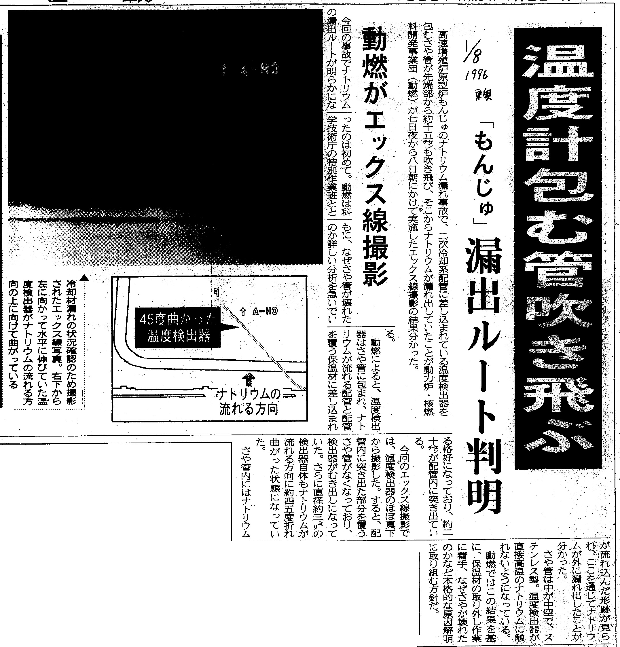 [1996_01_08_01]温度計包む菅吹き飛ぶ 「もんじゅ」漏出ルート判明 動燃がエックス線撮影(東奥日報1996年1月8日)