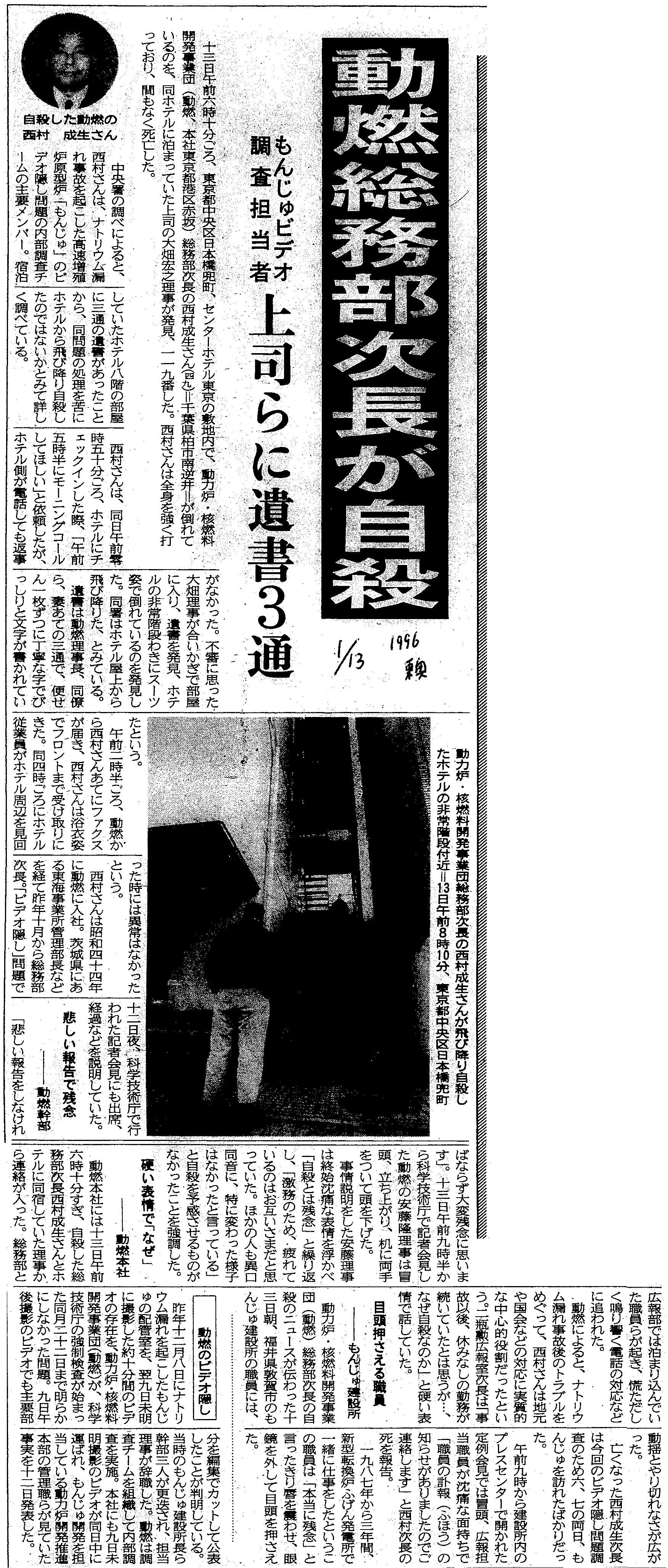 [1996_01_13_01]動燃総務部長が自殺 もんじゅビデオ調査担当者 上司らに遺書3通 悲しい報告で残念ー動燃幹部(東奥日報1996年1月13日)