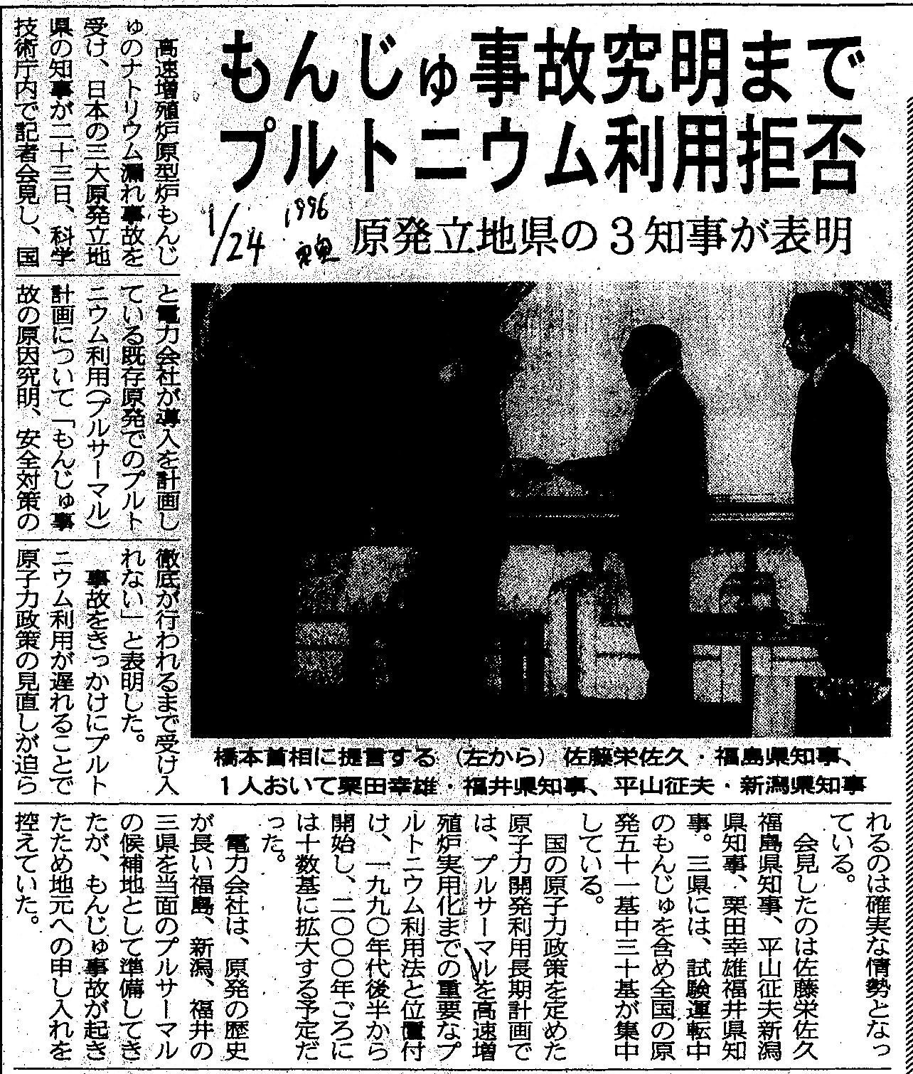 [1996_01_24_01]もんじゅ事故究明まで プルトニウム利用拒否 原発立地県の3知事が表明(東奥日報1996年1月24日)