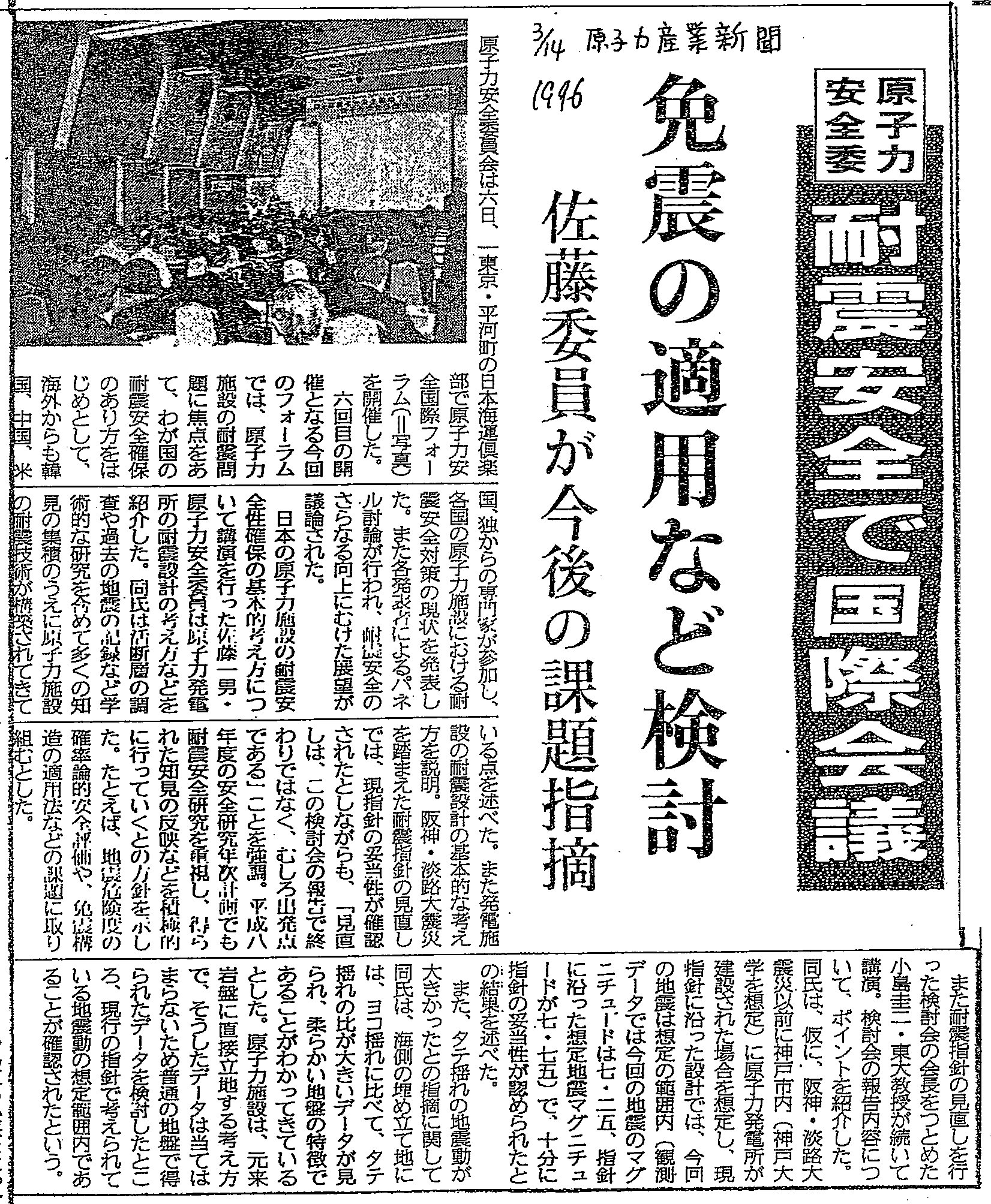 [1996_03_14_01]原子力安全委 耐震安全で国際会議 免震の適用など検討 佐藤委員が今後の課題指摘(原子力産業新聞1996年3月14日)