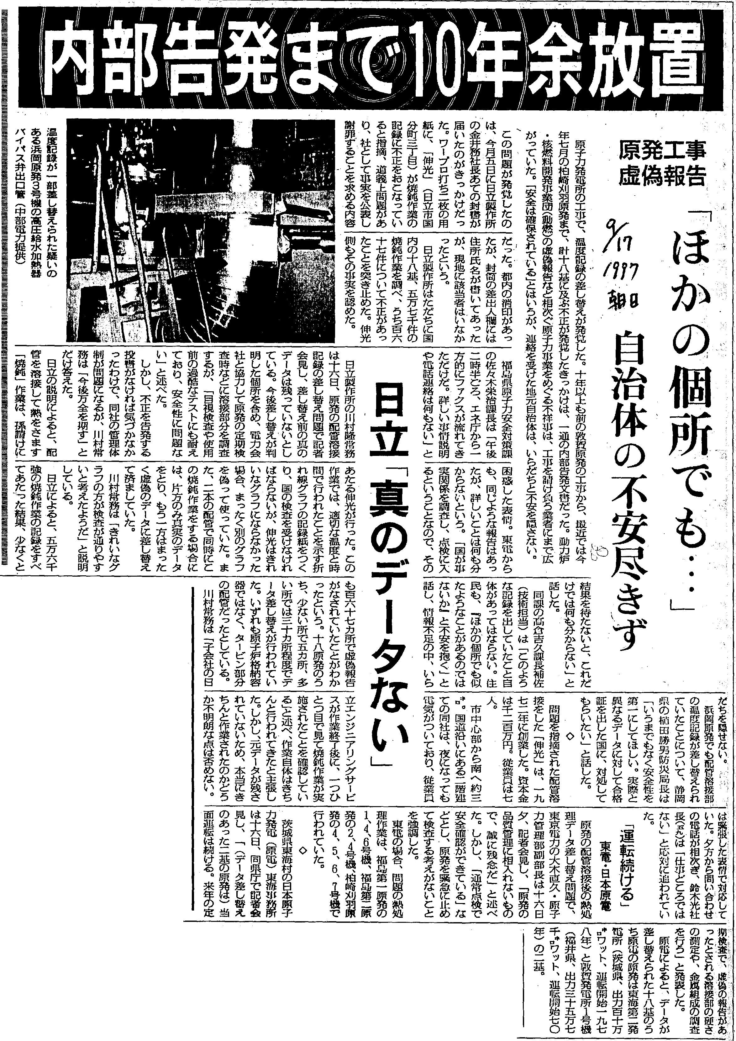 | [1997_09_17_01]内部告発まで10年余放置 原発工事虚偽報告 「ほかの個所でも・・・」 自治体の不安尽きず 日立「真のデータない」 「運転続ける」 東電・日本原電(朝日新聞1997年9月17日) |