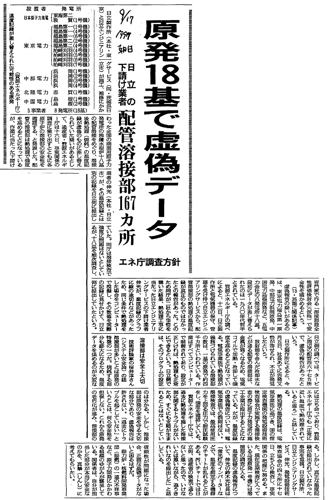 [1997_09_17_02]原発18基で虚偽データ 日立の下請け業者 配管溶接部167カ所 エネ庁調査方針(朝日新聞1997年9月17日)