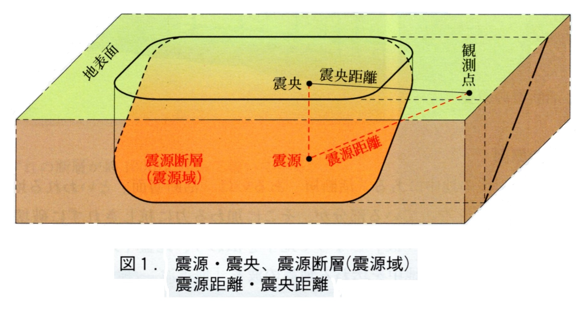 参照元 ![]() 地震が発生したとき、その地震を発生させた活断層の最初に破壊した点を「震源」、震源の真上の地表の点を「震央」という(図1)。また、一般に震央付近の地域を「震源地」ということがある。震央までの距離を「震央距離」、震源までの距離を「震源距離」という。 震源の「深さ」はほぼ0〜700kmであり、おおむね、100km以浅の地震を「浅発地震」、100kmを超える地震を「深発地震」としている。 地震の時、活断層は全体が同時にズレ動くのではなく、先づ最初にその活断層のどこか1点(震源)が破壊し、その破壊が順次伝わって行き活断層の一定の範囲まで広がる(第2章2.2)「断層破壊の仕組み」、42頁)、こうして破壊した活断層全体を「震源断層」、震源断層とそれに伴って活動した地域を「震源域」という(図1)。 |
