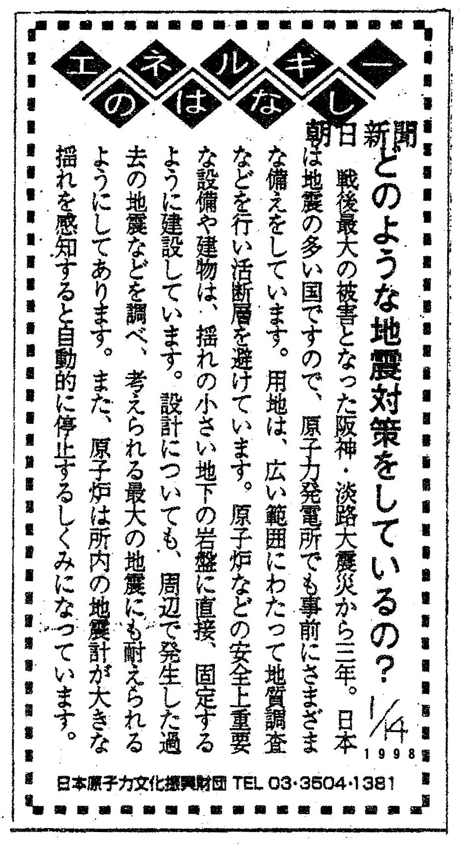 [1998_01_14_01]エネルギーのはなし どのような地震対策をしているの? 日本原子力文化振興財団(朝日新聞1998年1月14日)