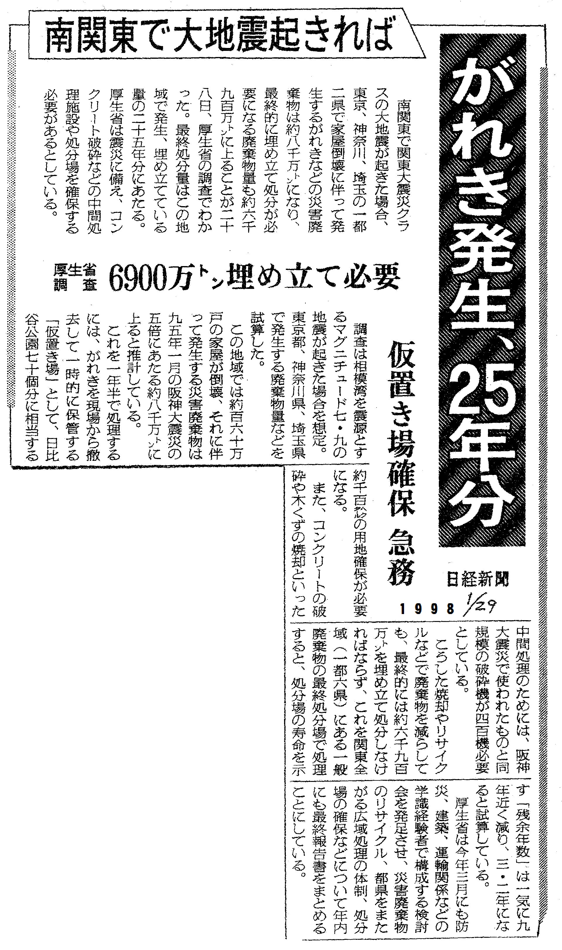 [1998_01_29_01]南関東で大地震起きれば がれき発生、25年分 厚生省調査 6900万トン埋め立て必要 仮置き場確保急務(日経新聞1998年1月29日)