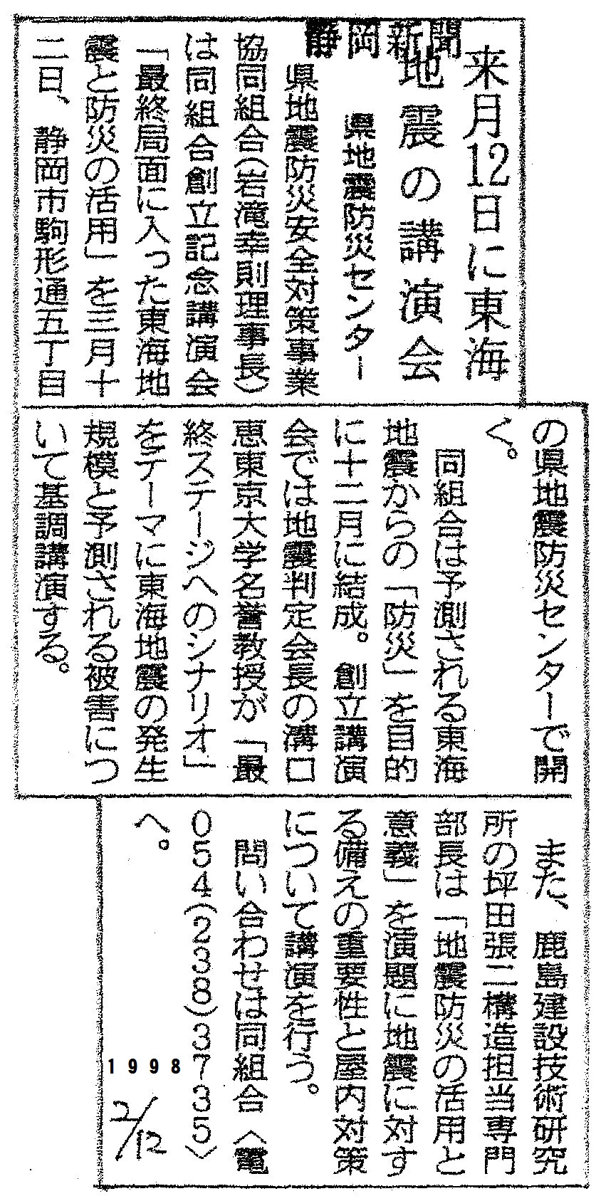 [1998_02_12_01]来月12日に東海地震の講演会 県地震防災センター(静岡新聞1998年2月12日)