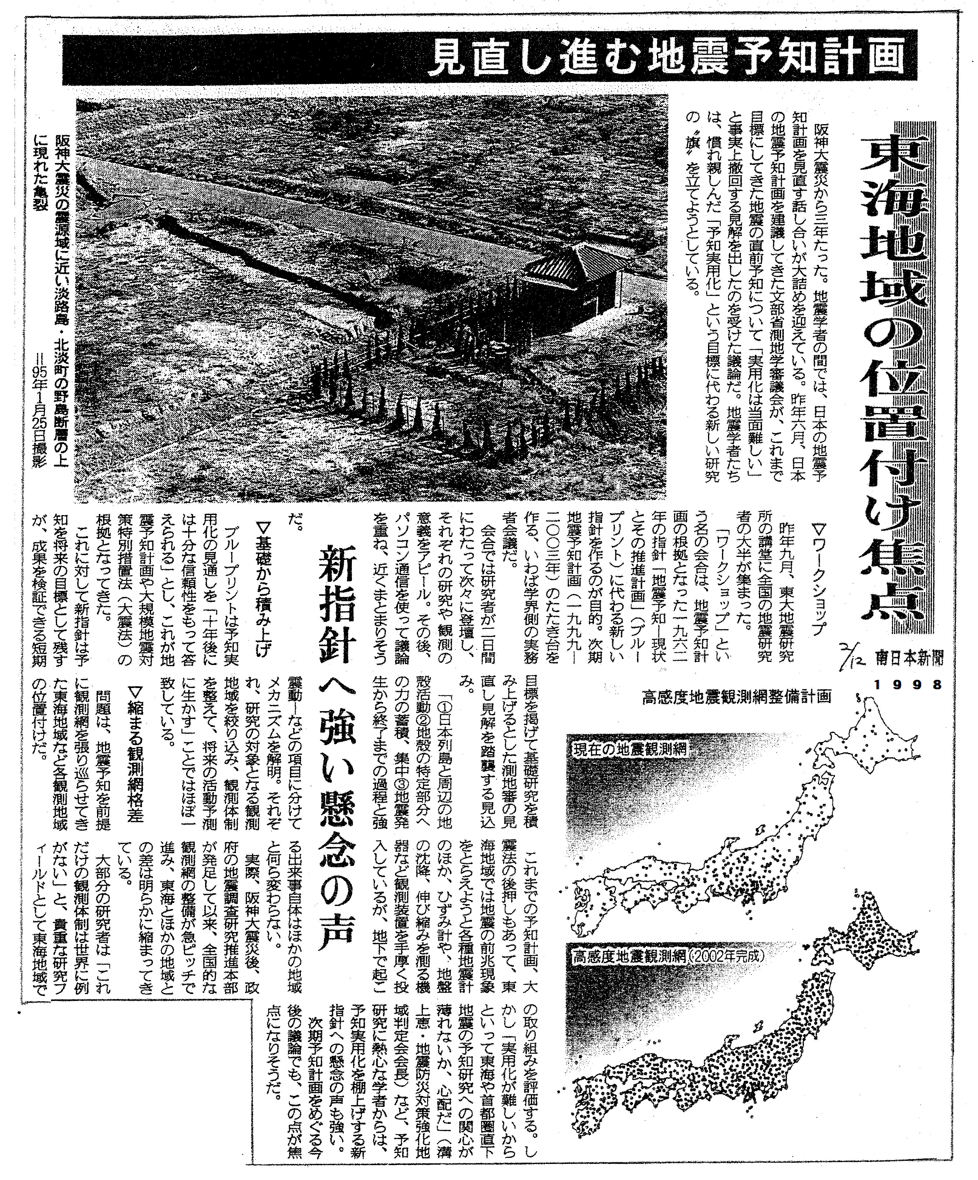 [1998_02_12_02]見直し進む地震予知計画 東海地域の位置付け焦点 新指針へ強い懸念の声 ワークショップ 基礎から積み上げ 縮まる観測網格差(南日本新聞1998年2月12日)