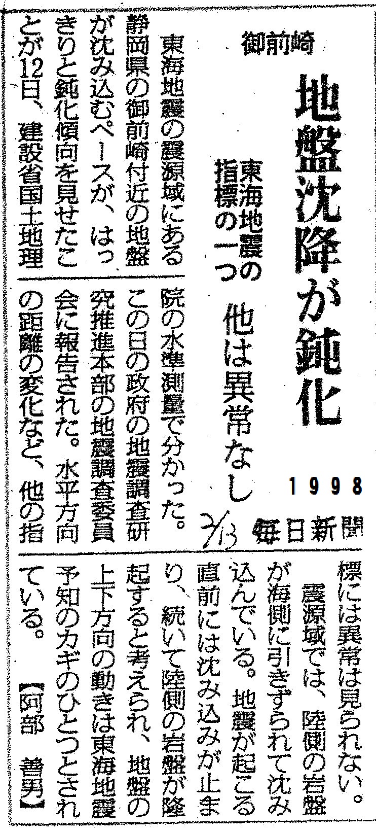 [1998_02_13_02]御前崎 地盤沈降が鈍化 東海地震の指標の一つ 他は異常なし(毎日新聞1998年2月13日)
