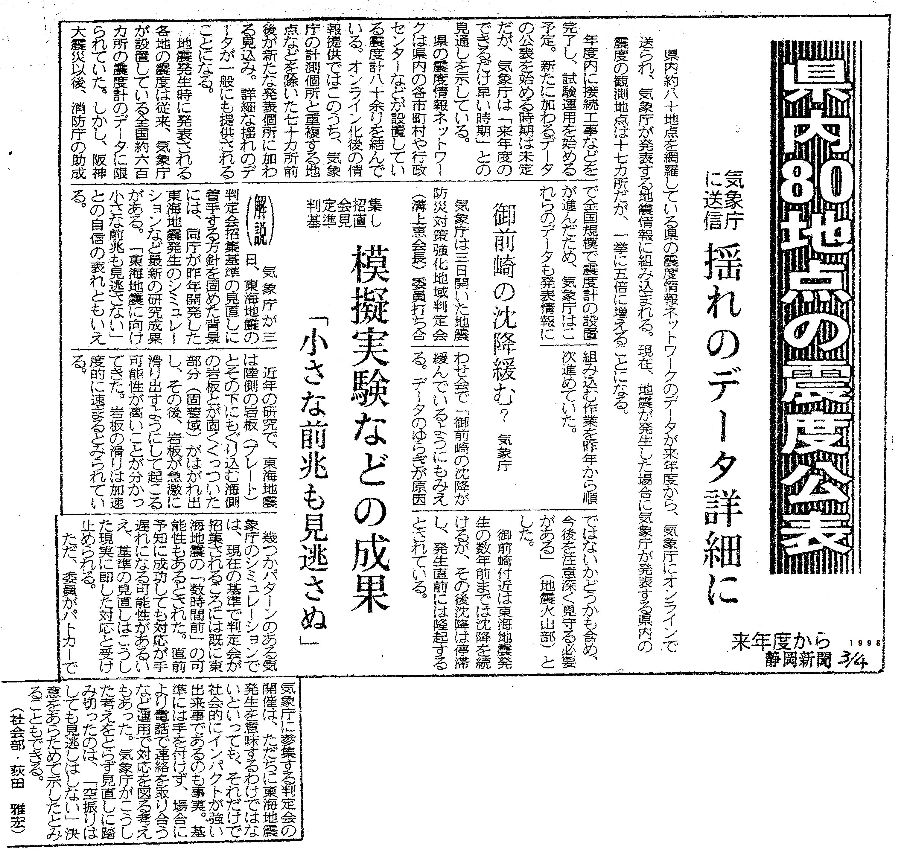 [1998_03_04_01]県内80地点の震度公表 気象庁に送信 揺れのデータ詳細に 来年度から 御前崎の沈降緩む? 気象庁 判定会招集基準見直し 模擬実験などの成果 「小さな前兆も見逃さぬ」(静岡新聞1998年3月4日)