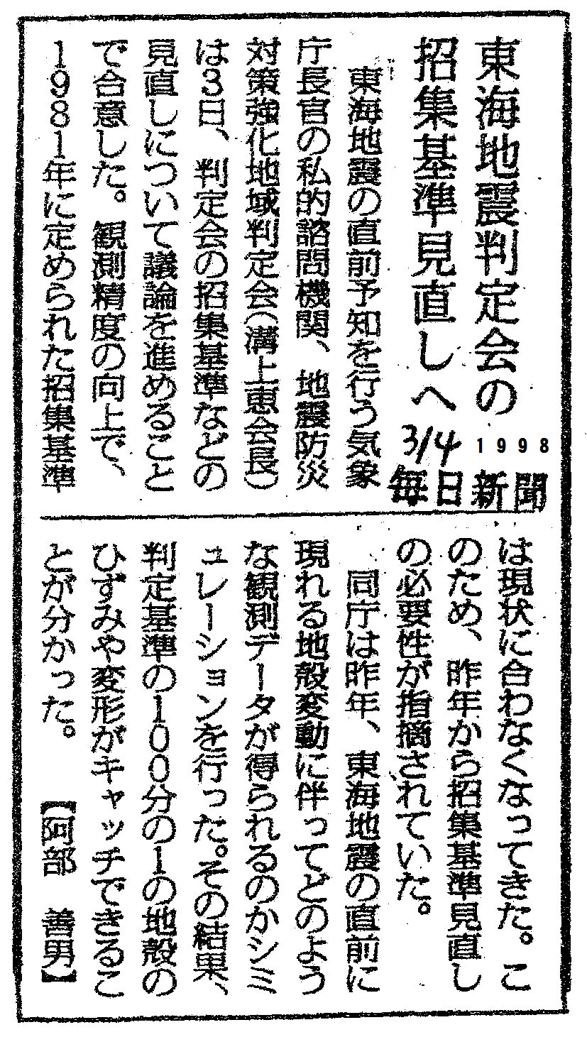 [1998_03_04_02]東海地震判定会の招集基準見直しへ(毎日新聞1998年3月4日)