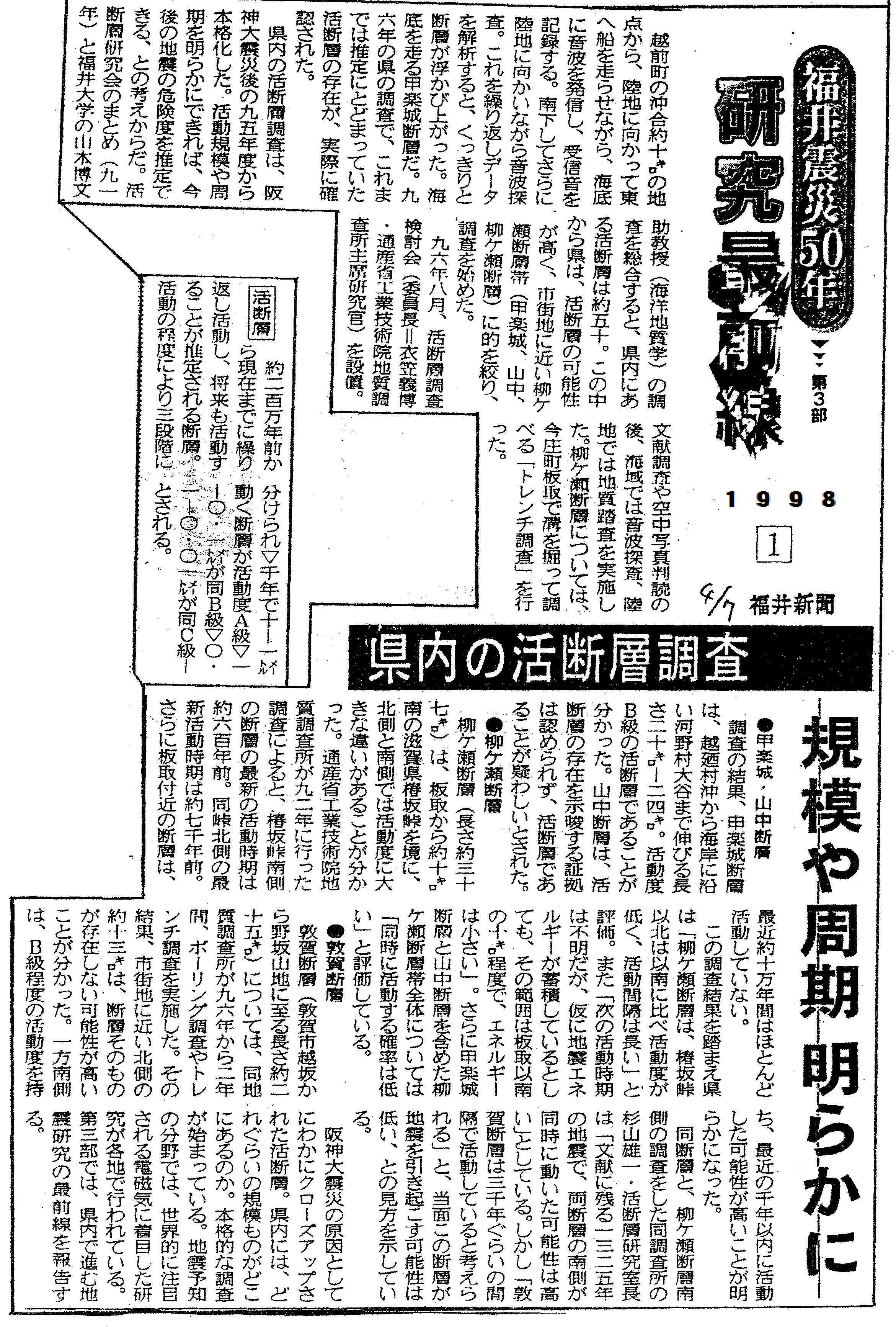 | [1998_04_07_01]福井震災50年 研究最前線 県内の活断層調査 規模や周期明らかに 甲楽城・山中断層 柳ケ瀬断層 敦賀断層(福井新聞1998年4月7日) |