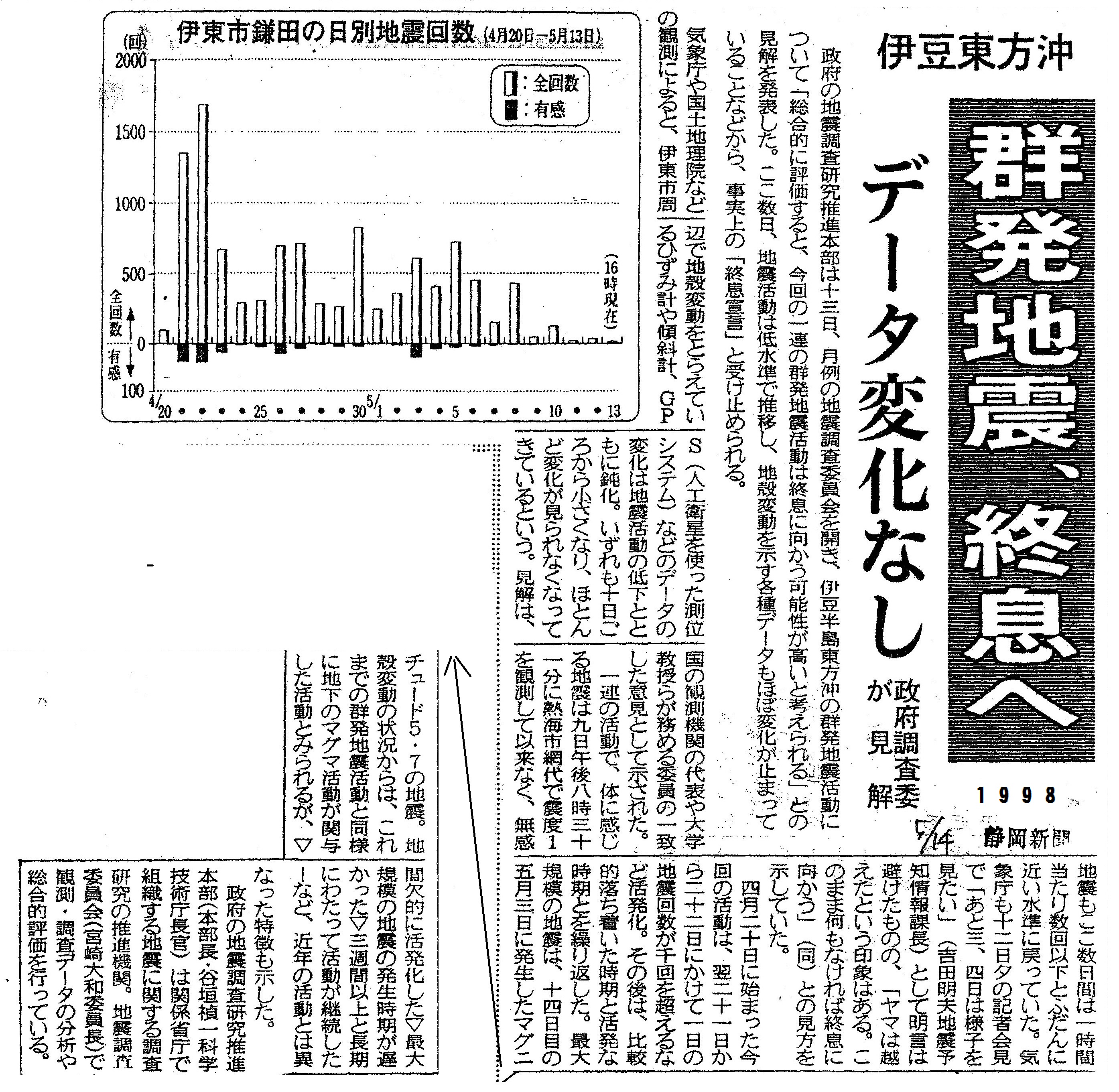 [1998_05_14_01]伊豆東方沖 群発地震、終息へ データ変化なし 政府調査委が見解(静岡新聞1998年5月14日)