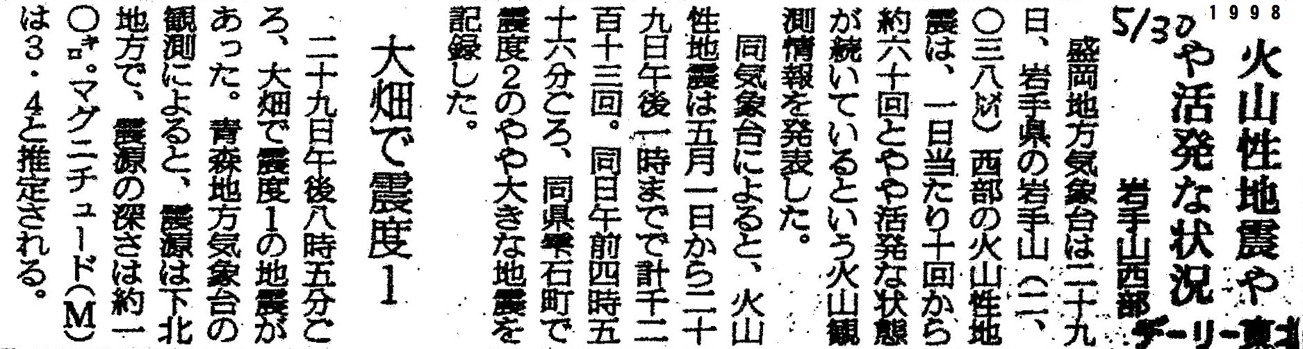 [1998_05_30_01]火山性地震やや活発な状況 岩手山西部 大畑で震度1(デーリー東北1998年5月30日)