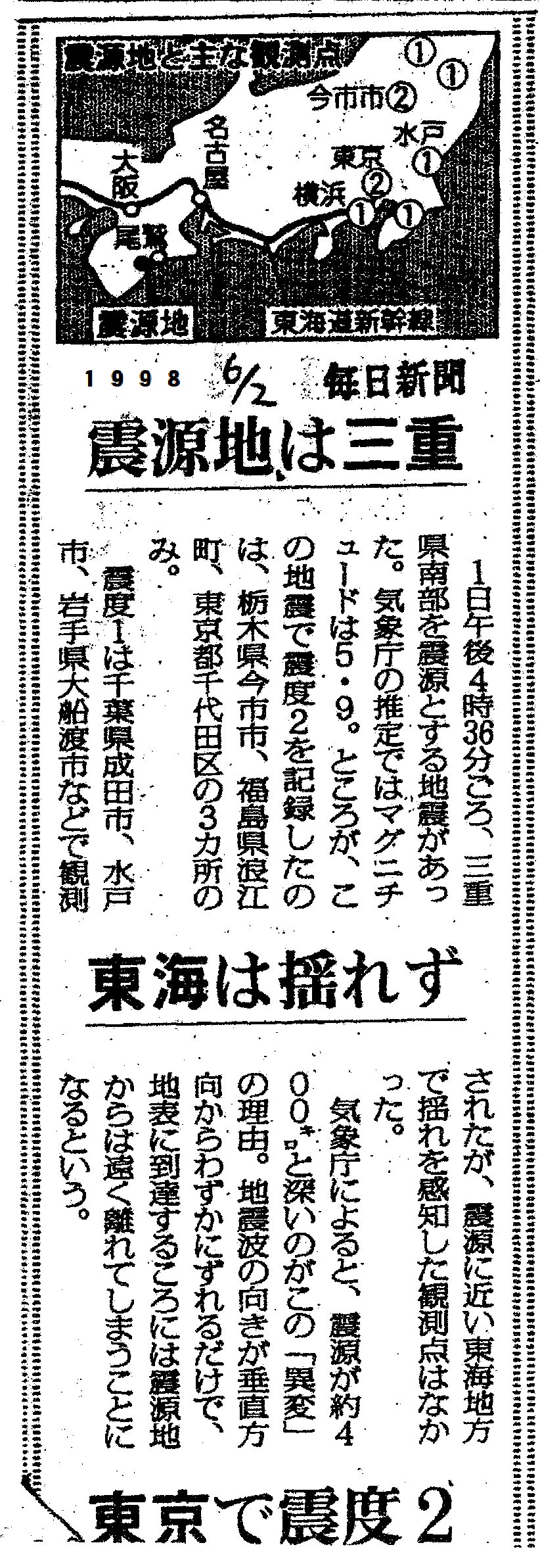 [1998_06_02_01]震源地は三重 東海は揺れず 東京で震度2(毎日新聞1998年6月2日)