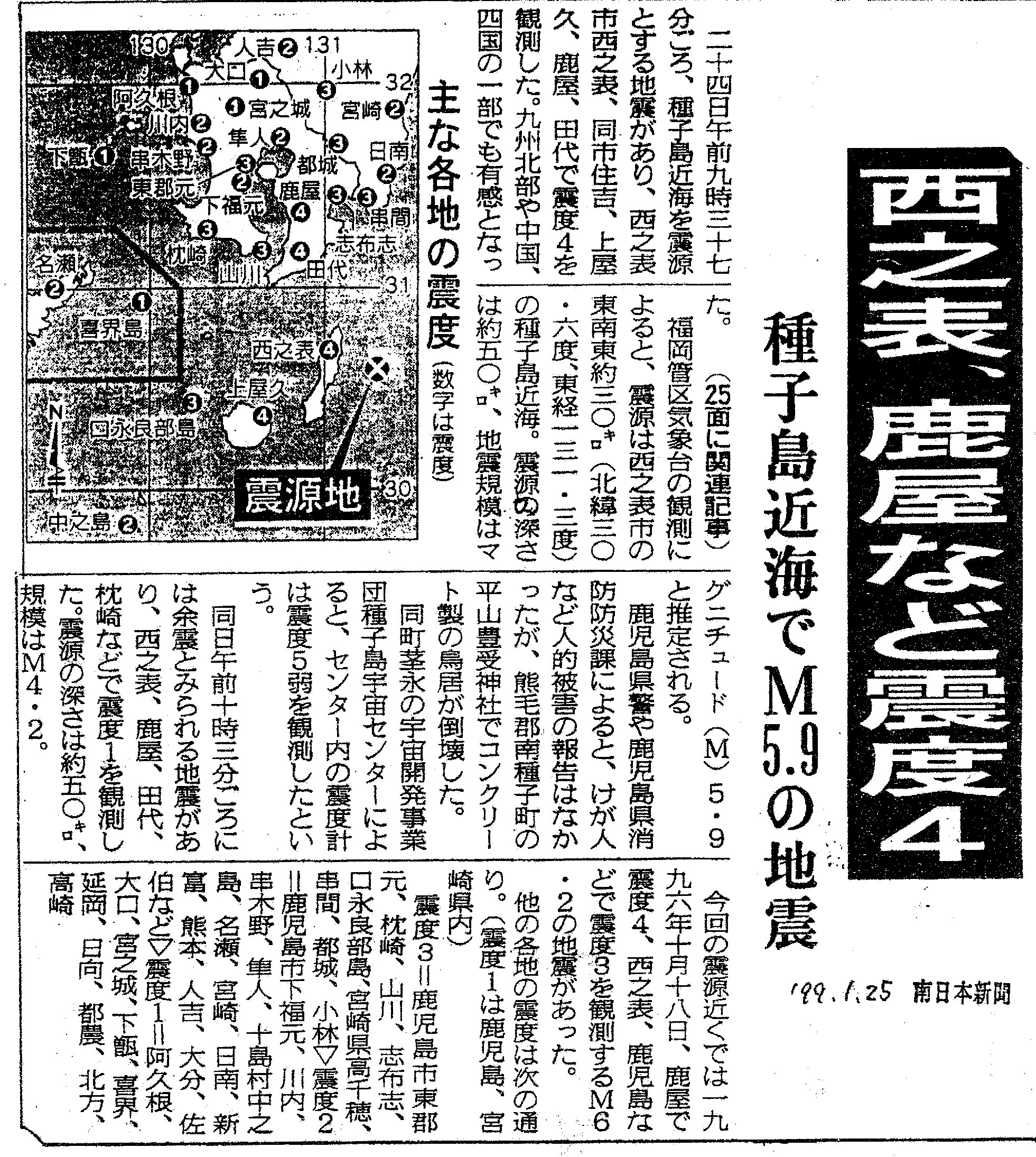 [1999_01_25_01]西之表、鹿屋など震度4 種子島近海でM5.9の地震(南日本新聞1999年1月25日)