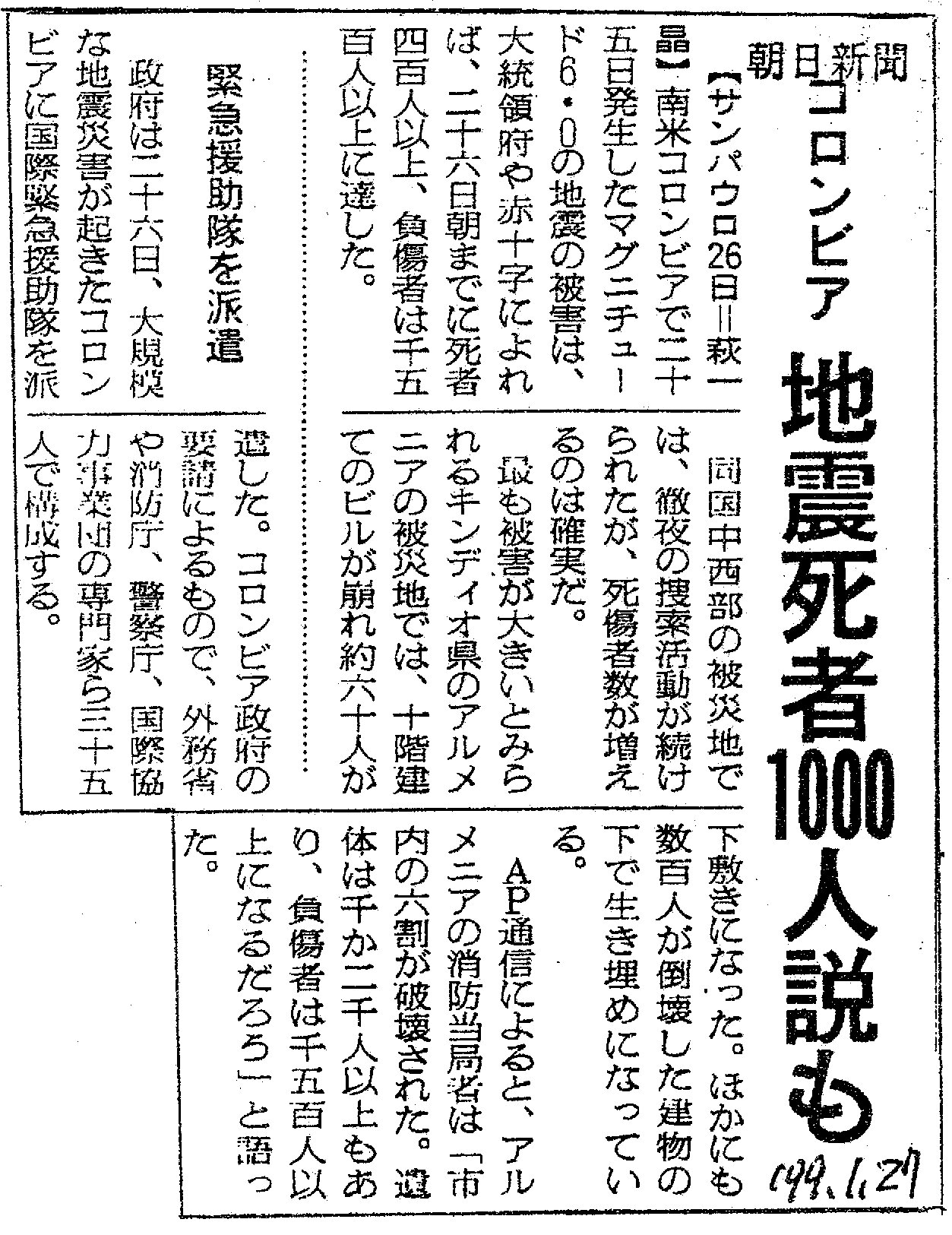 [1999_01_27_01]コロンビア 地震死者1000人説も 緊急援助隊を派遣(朝日新聞1999年1月27日)