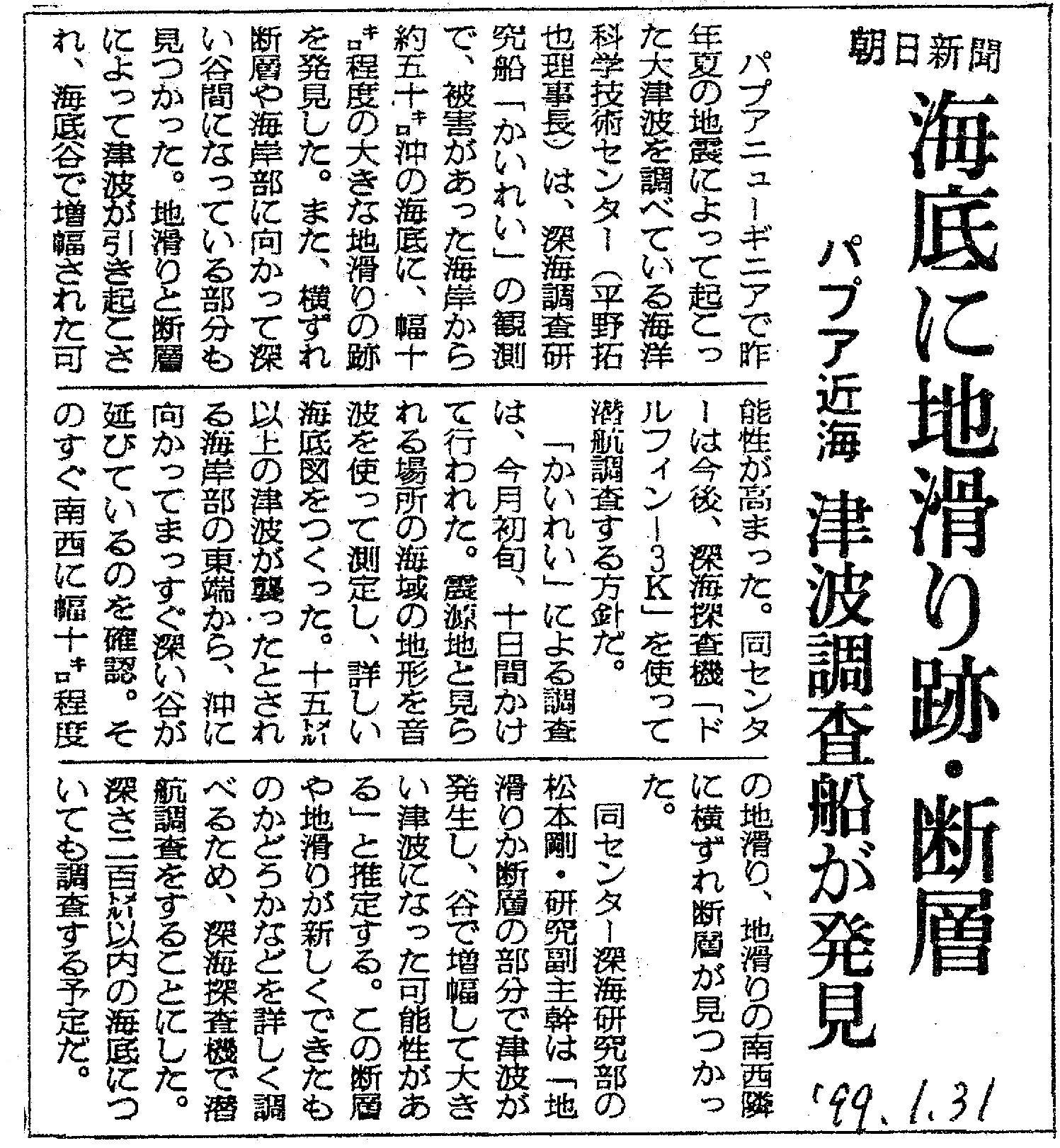 | [1999_01_31_01]海底に地滑り跡・断層 パプア近海 津波調査船が発見(朝日新聞1999年1月31日) |