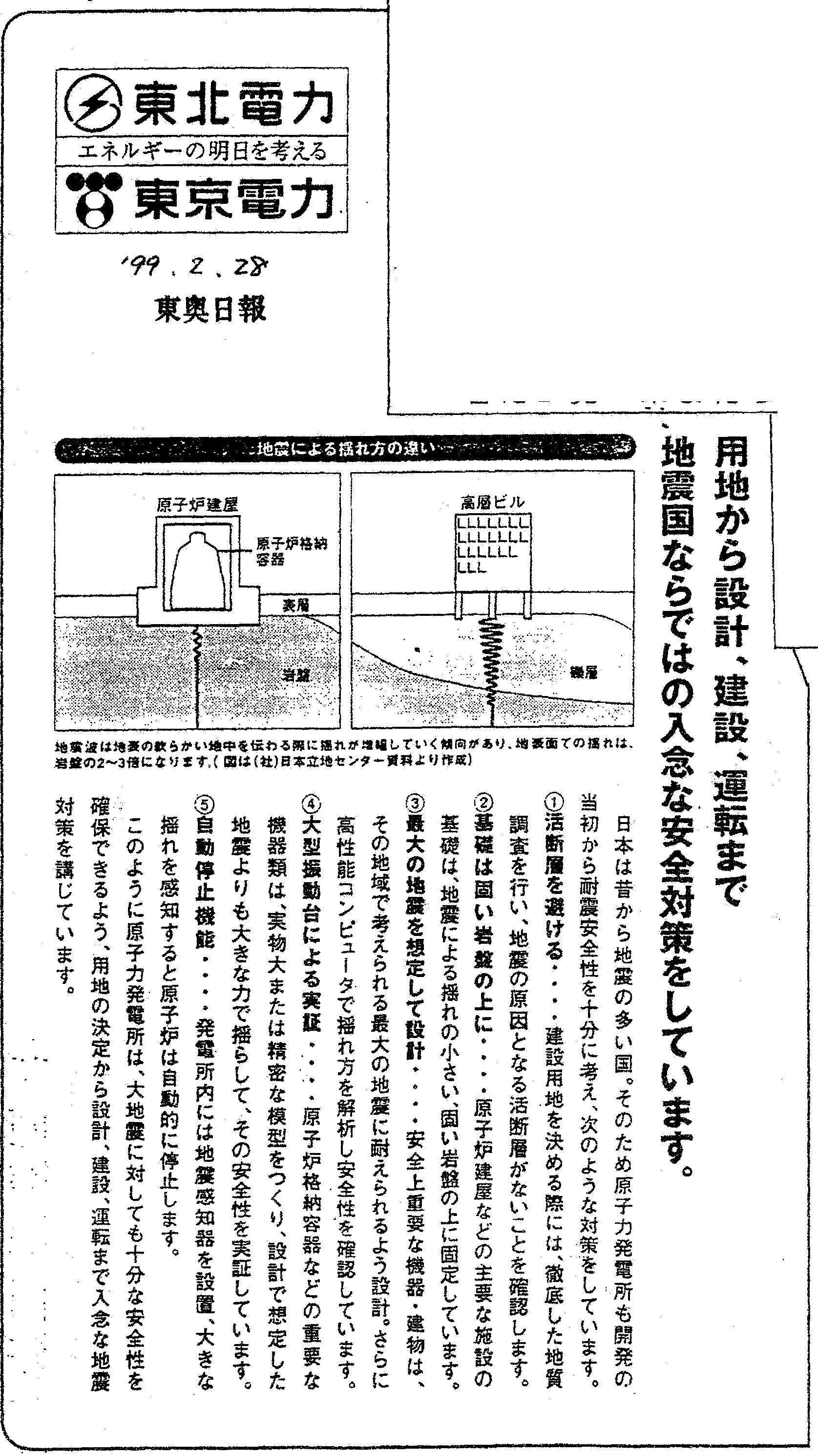 [1999_02_28_01]東北電力 東京電力 用地から設計、建設、運転まで 地震国ならではの入念な安全対策をしています。(東奥日報1999年2月28日)