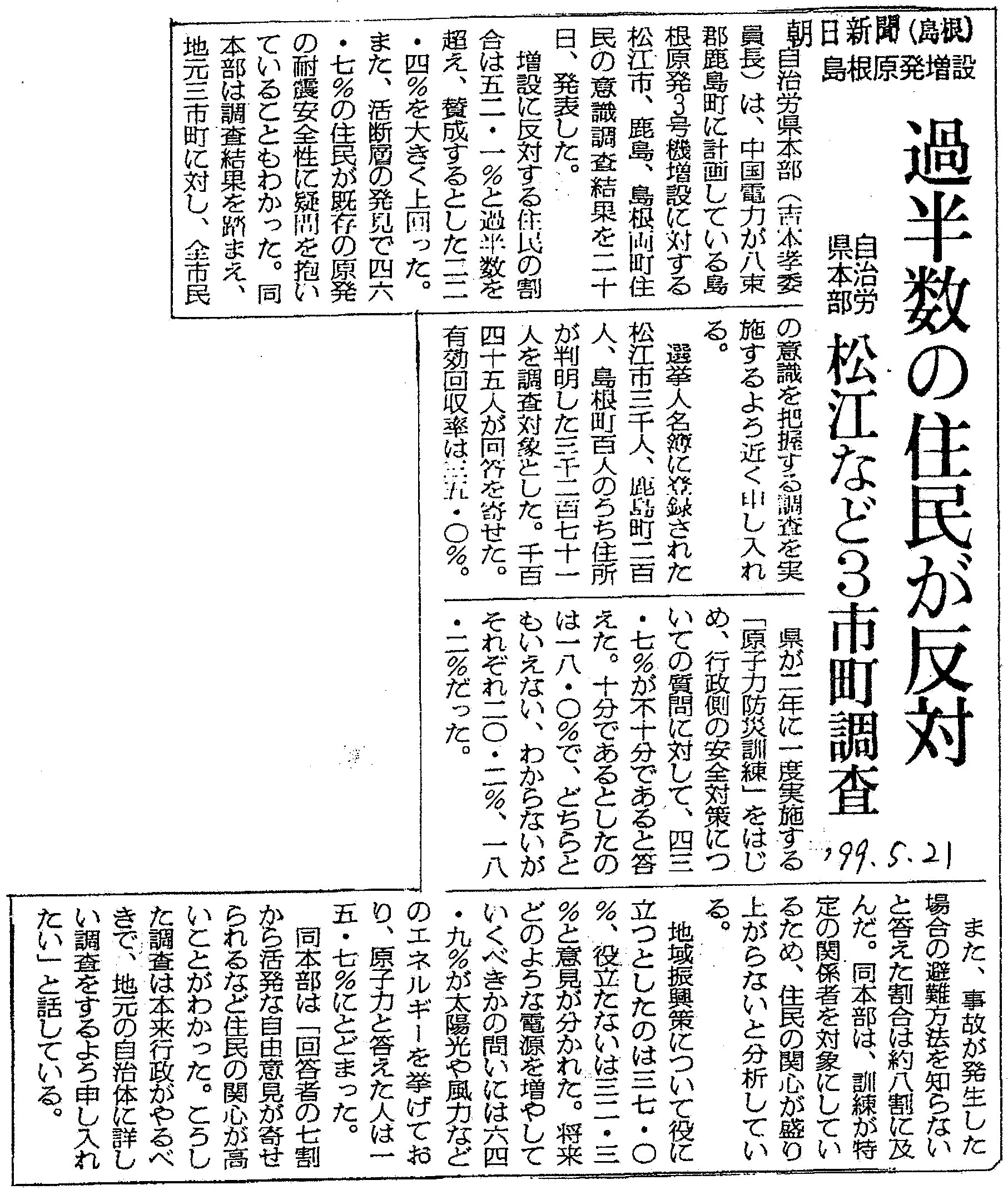 [1999_05_21_01]島根原発増設 過半数の住民が反対 自治労県本部 松江など3市町村調査(朝日新聞1999年5月21日)